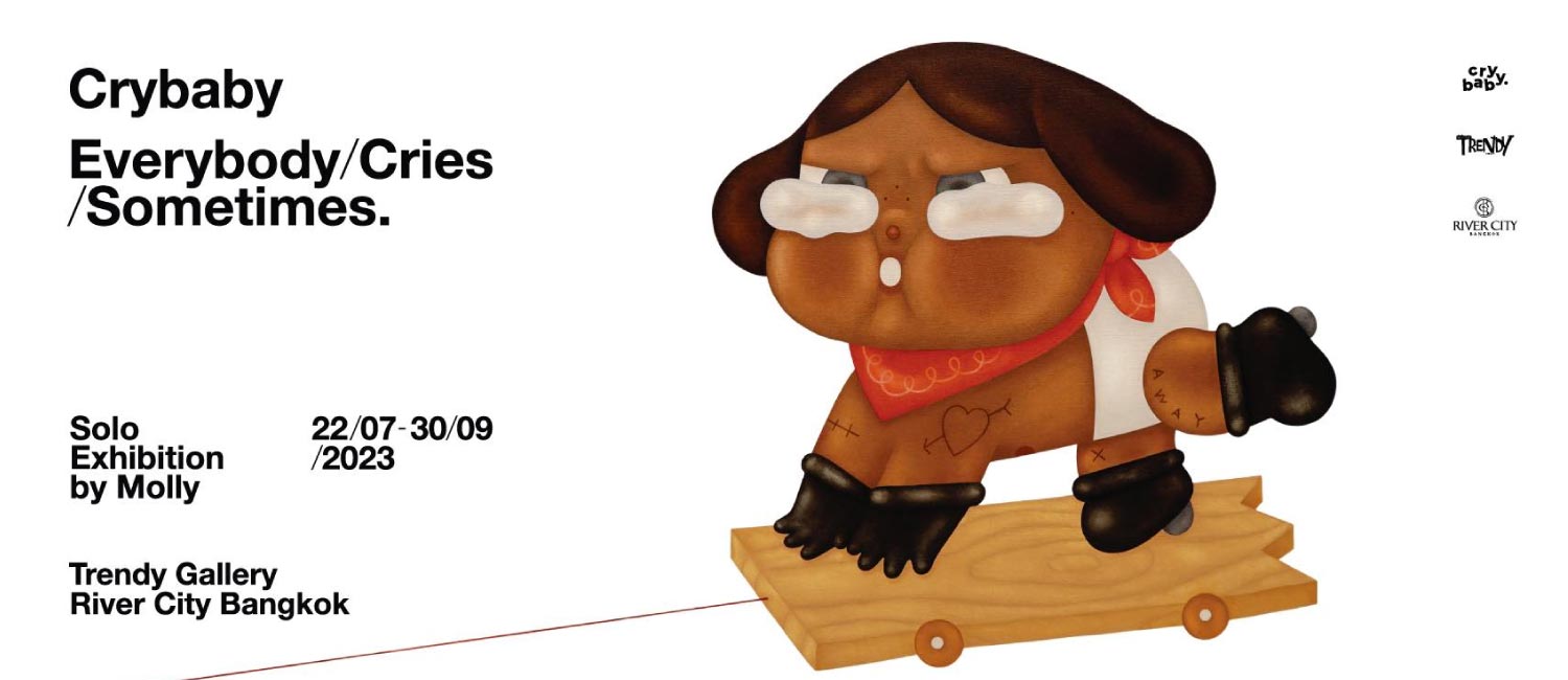 เมื่อฉันนั้นก็ร้องไห้ เธอเองก็เคยร้องไห้ และพวกเราทุกคนต่างก็ร้องไห้ แล้วทำไมเรายังต้องร้องไห้เพียงลำพัง? Everybody Cries Sometimes เป็นนิทรรศการเดี่ยว โดย มด-นิสา ศรีคำดี หรือที่นักสะสมรู้จักกันในชื่อ มอลลี่ เจ้าของคาแรกเตอร์เด็กผู้หญิงเจ้าน้ำตา CRYBABY ที่สื่อสารให้ผู้คนเข้าใจว่า การร้องไห้และน้ำตาเป็นองค์ประกอบธรรมดาๆ ในชีวิตของทุกคน สำหรับการกลับมาจัดแสดงผลงานในครั้งนี้ เทรนดี้ แกลเลอรี่ ร่วมกับ ริเวอร์ ซิตี้ แบงค็อก และศิลปินจะทุกคนไปท่องโลกของความรู้สึก เบื้องหลังหยดน้ำตา ความเสียใจ และการร้องไห้ จะมีเรื่องราวแบบไหนซุกซ่อนอยู่บ้าง เป็นอีกหนึ่งนิทรรศการที่นักสะสมต้องตื่นตาตื่นใจ และคนทั่วไปจะได้รับการปลอบประโลมหัวใจอย่างแน่นอน วันที่ 22 กรกฎาคม - 30 กันยายน 2566 / Trendy Gallery, River City Bangkok