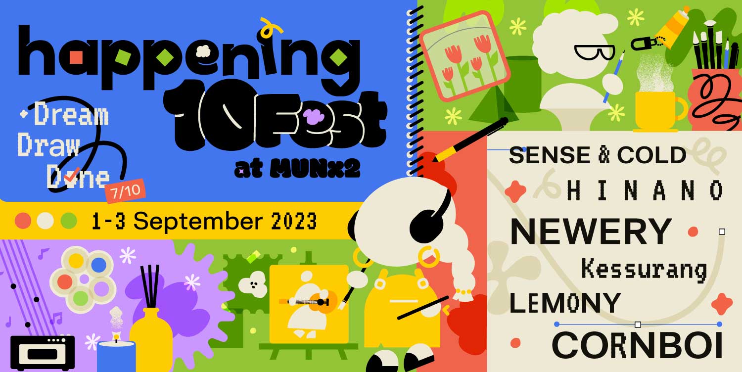 ชวนมาวาดสีสันลงผ้าใบของความฝันไปด้วยกัน! ในงาน happening 10Fest ครั้งที่ 7/10 ที่มาในธีม DREAM DRAW DONE เดือนกันยายนนี้เหล่าศิลปินนักวาด นักปั้น และนักร้องนักดนตรี จะมาแสดงสีสันของความสนุกผ่านภาพวาด งานปั้น และดนตรี ที่จะมาเติมเต็มชีวิตจริงให้กับทุกคน