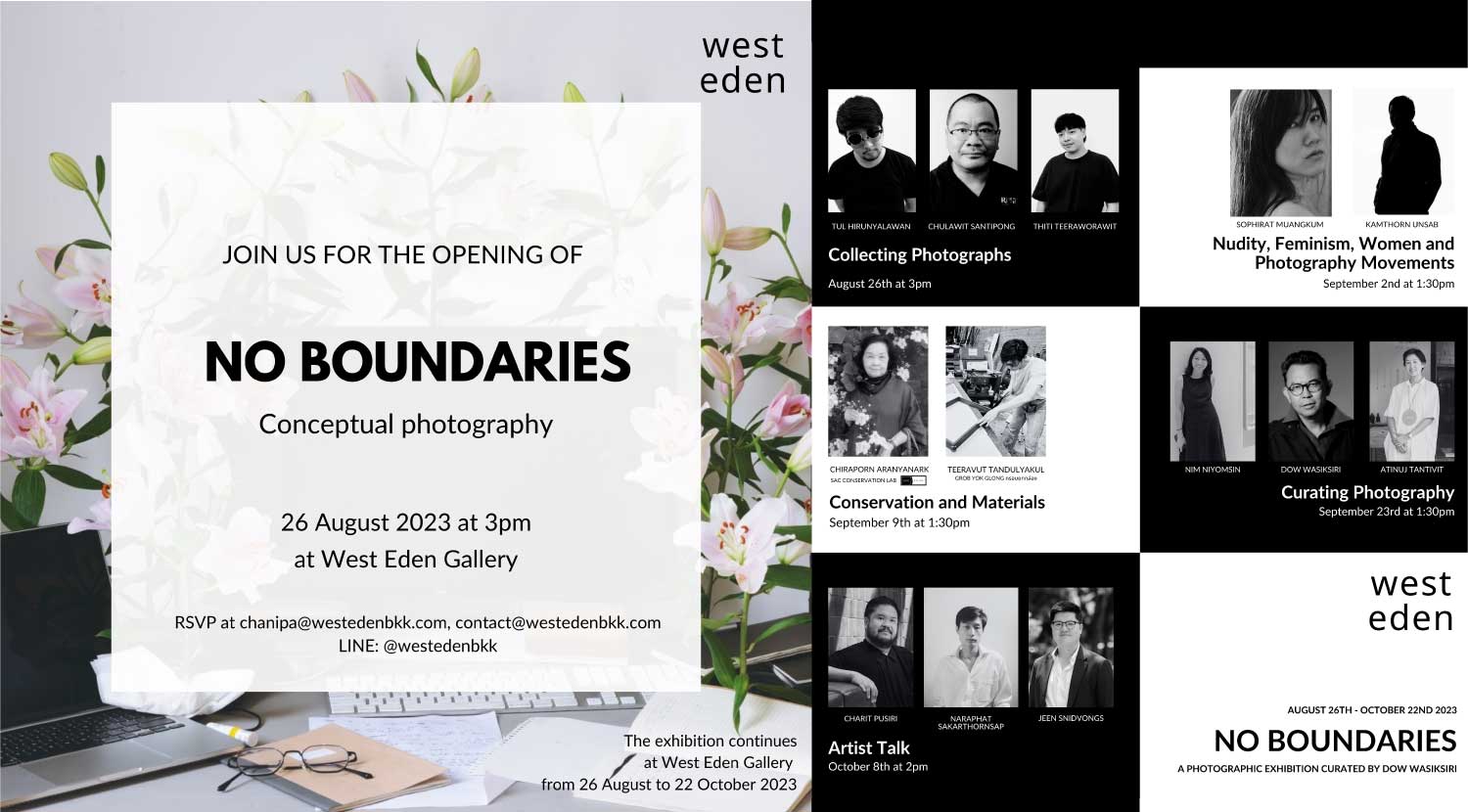 นิทรรศการภาพถ่าย NO BOUNDARIES สะท้อนถึงความไร้ขอบเขตของงานศิลปะ โดย ดาว วาสิกศิริ ทำหน้าที่เป็นภัณฑารักษ์ คัดเลือกผลงานที่หลากหลายจากศิลปินหลายรุ่น 13 ราย ได้แก่ พิทยา นนทเปารยะ, ตุลย์ หิรัญรัญลาวัลย์, สิริมา ไชยปรีชาวิทย์, อัครา นักทํานา, Jojakim Cortis & Adrian Sonderegger, โศภิรัตน์ ม่วงคํา, พิทยา นนทเปารยะ, ทอม โพธิสิทธิ์, ชฤต ภู่ศิริ, อรอินท์ เรืองวัฒวันสุข, นรภัทร ศักดิ์อาธรทรัพย์, จุฬวิศว์ ศานติพงศ์, กนก สุริยริสัตย์ และรวมทั้งผลงานของตัวเอง ดาว วาสิกศิริ ด้วย
