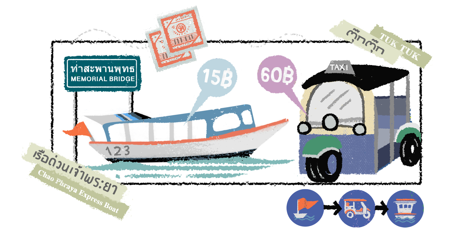 เดินกลับมาที่ท่าโอเรียนเต็ลเพื่อนั่งเรือธงส้มไปยังจุดต่อไป ปกติจะใช้เวลารอเรือแต่ละรอบประมาณ 15-20 นาที แต่ถ้าใช้โอกาสนี้ในการพูดคุยกับเพื่อนที่มาด้วยกันถึงงานแต่ละชิ้นที่เพิ่งไปดูมา เวลาก็จะผ่านไปอย่างรวดเร็ว ค่าบริการเรือธงส้มคนละ 15 บาท ลงที่ท่าสะพานพุทธแล้วต่อตุ๊กๆ ข้ามไปยังวัดประยุรวงศาวาสวรวิหาร ค่ารถประมาณ 60 บาท