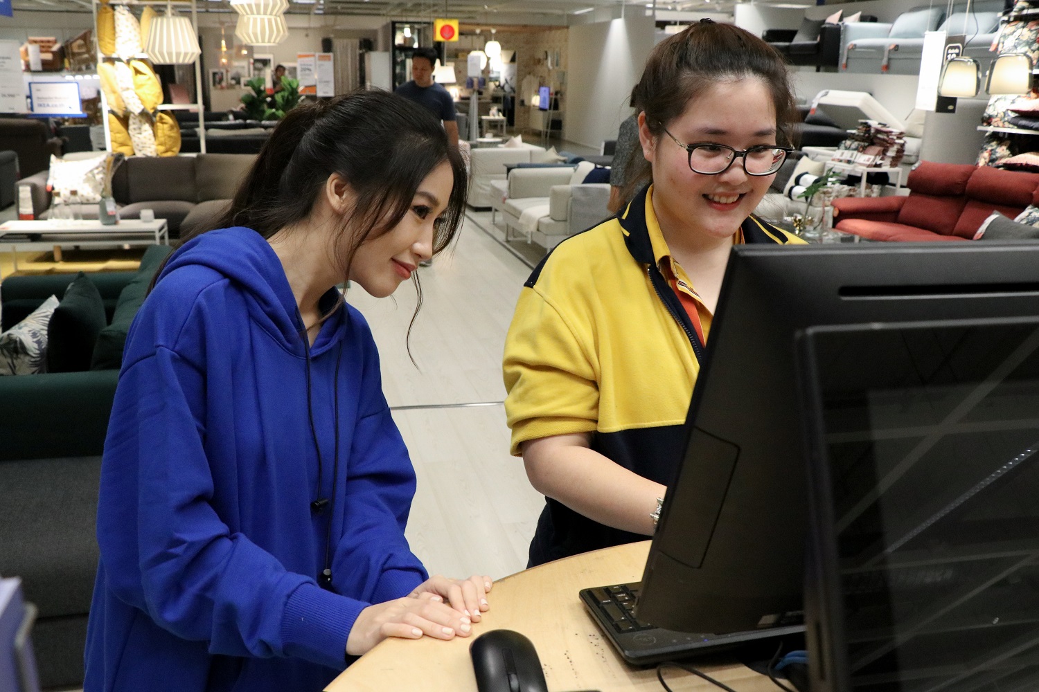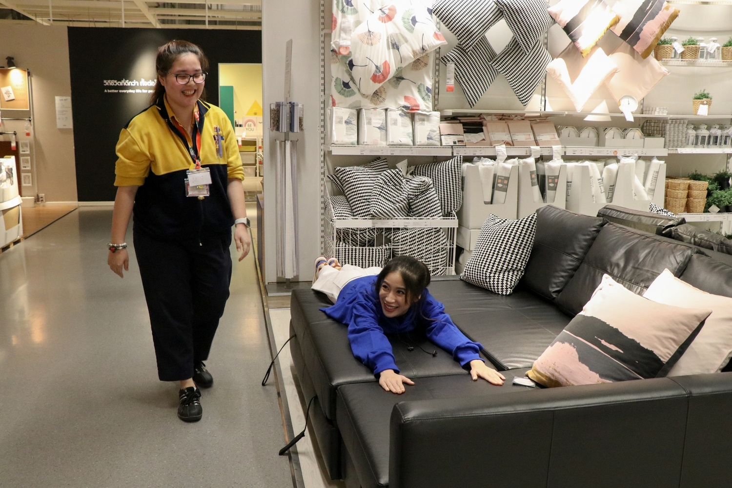 แจนจังพาเราเดินหาโซฟาเบดที่อยากได้อีกตัว เธอมองหาพนักงาน เพื่อสอบถามถึงตำแหน่งเฟอร์นิเจอร์ที่อยากได้ ถ้าคุณอยากได้ความช่วยเหลือจากพนักงาน พวกเขาก็ประจำการอยู่มุมเหล่านี้ที่กระจายไปทั่วสโตร์ อย่างแจนจังเองก็ขอคำแนะนำจากพนักงานเรื่องโซฟาเบดตัวใหม่