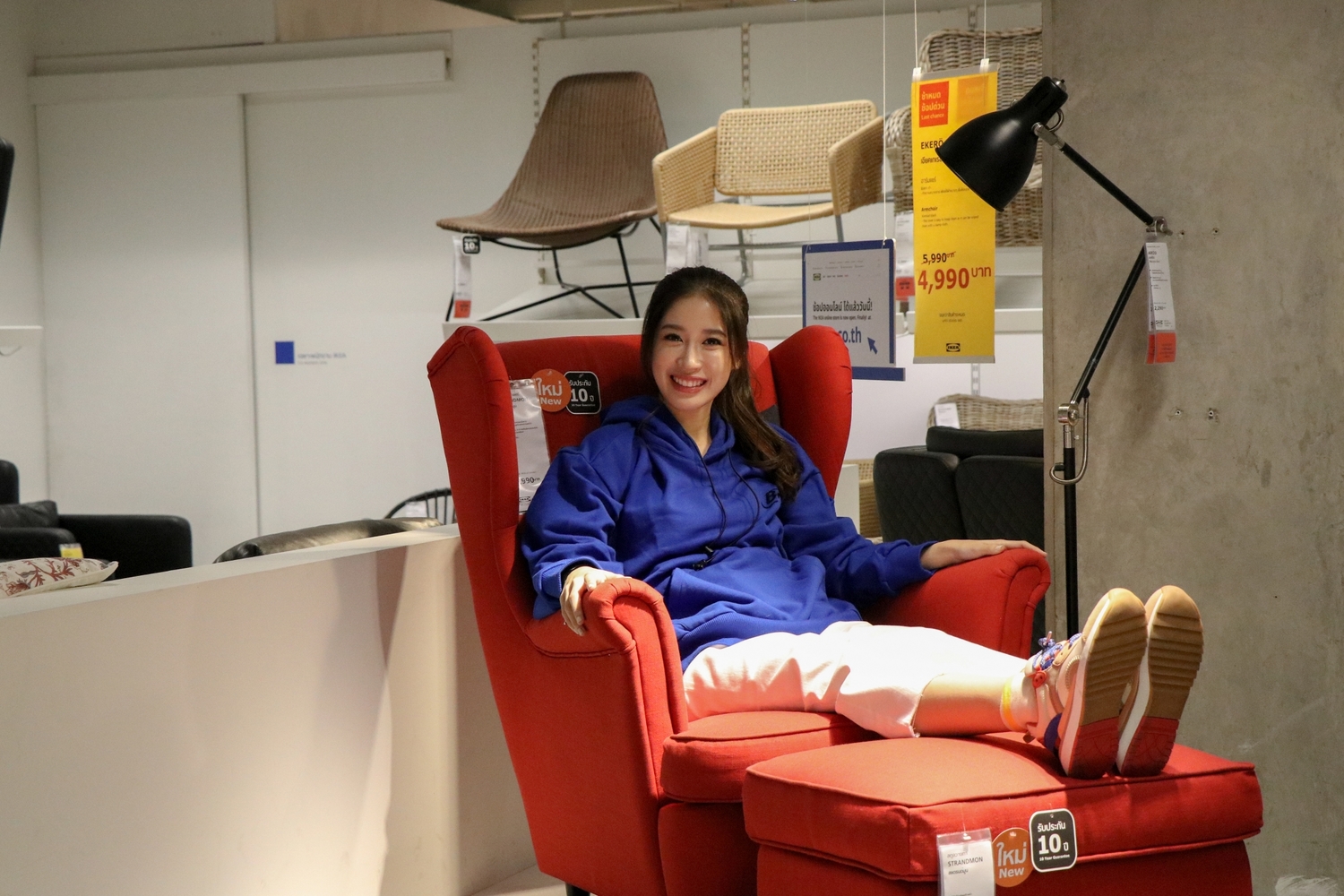 มาเริ่มกันที่โซนแรก เรียงรายไปด้วยโซฟาและอาร์มแชร์มากมาย แจนจังรีบพุ่งตัวเข้าหาโซฟาสีเหลืองสดใสทันที ก่อนลองนั่งเพื่อทดสอบความนุ่มสบาย ซึ่งทางอิเกียก็ยินดีต้อนรับลูกค้าทุกคนที่อยากลองนั่งหรือทดสอบความสบายของเฟอร์นิเจอร์ส่วนนี้