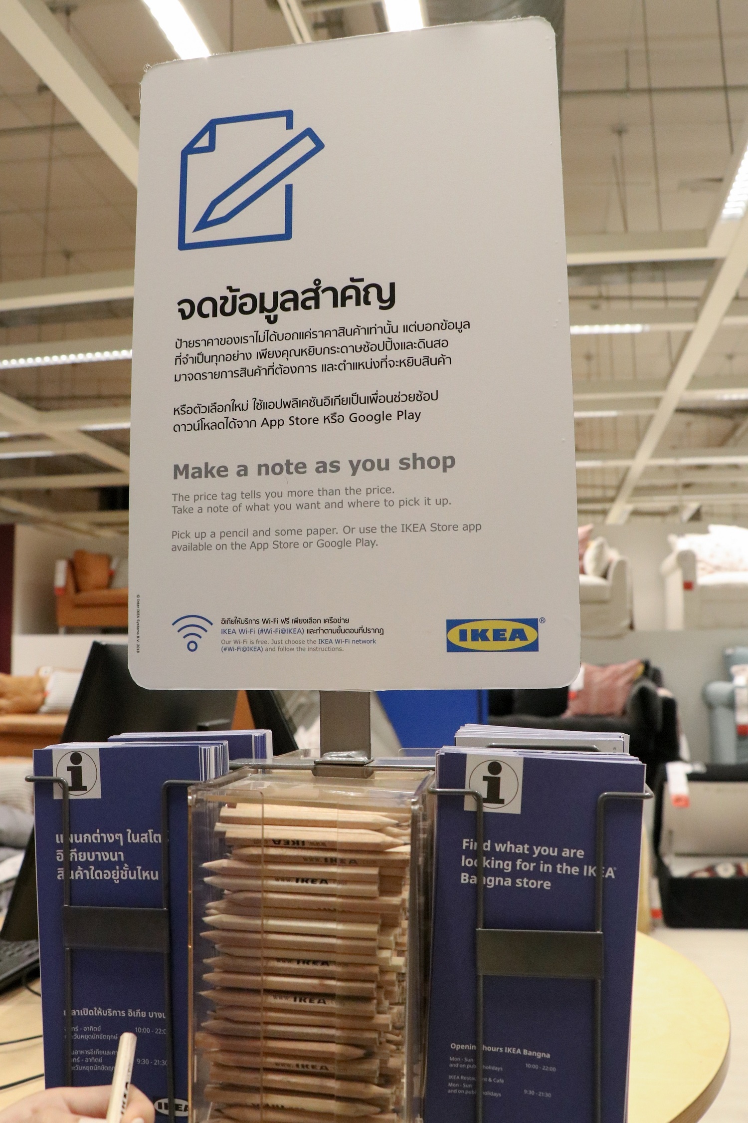 ไม่ไกลกันนัก เราก็เจอมุมบริการดินสอและกระดาษจดรายการสินค้าที่เป็นเอกลักษณ์เฉพาะอิเกียเท่านั้น ซึ่งมีไว้สำหรับจดรายละเอียดสินค้า หมายเลขแถว และช่องของชั้นวางสินค้าที่เราต้องการด้วย