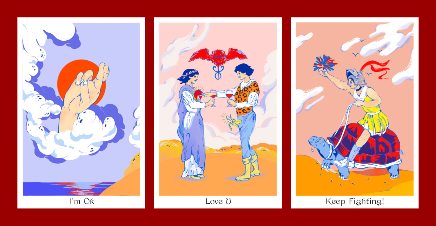สีฟ้าสดใสตัดกับสีโทนร้อน เป็นส่วนผสมที่ลงตัว ชวนให้เราจดจ้องไปตามรายละเอียดภายในภาพ ขณะที่การจัดวางข้อความและภาพประกอบที่ไม่เข้าคู่กัน อย่าง I'm OK และนิ้วมือที่ไขว้กัน ก็ทำให้เรานึกย้อนไปถึงความเป็นมนุษย์ที่มักไม่กล้าแสดงความรู้สึกตรงๆ ออกมา ภายใต้คำพูดอย่างการขอโทษหรือบอกรัก มักมีความหมายอื่นแฝงตัวอยู่เสมอ
