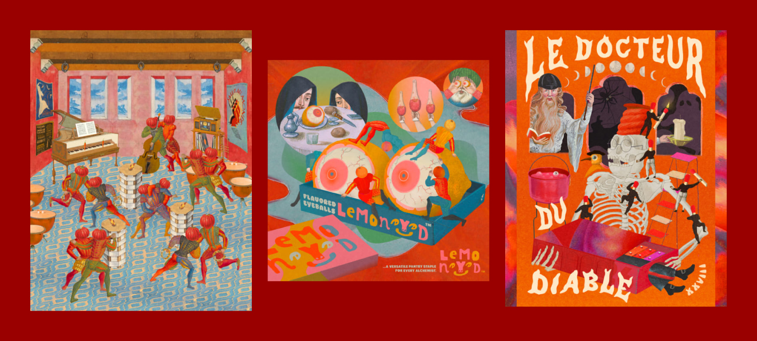 ศิลปินได้เลือกใช้โทนสีสดและการจับคู่สีที่หลากหลาย ทำให้ภาพมีความน่าสนใจและมีมิติ การจัดองค์ประกอบภาพที่คล้ายกับเหล่าตัวละครกำลังเคลื่อนไหวอยู่ พาให้เรารู้สึกสนุกสนาน แต่ก็แฝงไปด้วยบรรยากาศที่ดูแปลกตา จากความเหนือจริงที่ศิลปินถ่ายทอดออกมาจากจินตนาการ