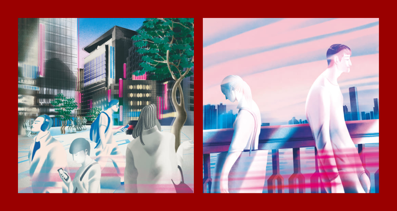 ผลงานภาพประกอบของ jiyunK ศิลปินชาวเกาหลี มีส่วนผสมระหว่างสีสัน เทคนิคการนำเสนอ และมุมมองการเล่าเรื่อง เป็นสิ่งที่ทำให้ภาพนี้โดดเด่น และทำให้เราสัมผัสได้ถึงบรรยากาศความเงียบเหงาและโดดเดี่ยว ท่ามกลางผู้คนที่จดจ่ออยู่ในเส้นทางของตัวเอง สะท้อนภาพสังคมก้มหน้าในปัจจุบันได้เป็นอย่างดี