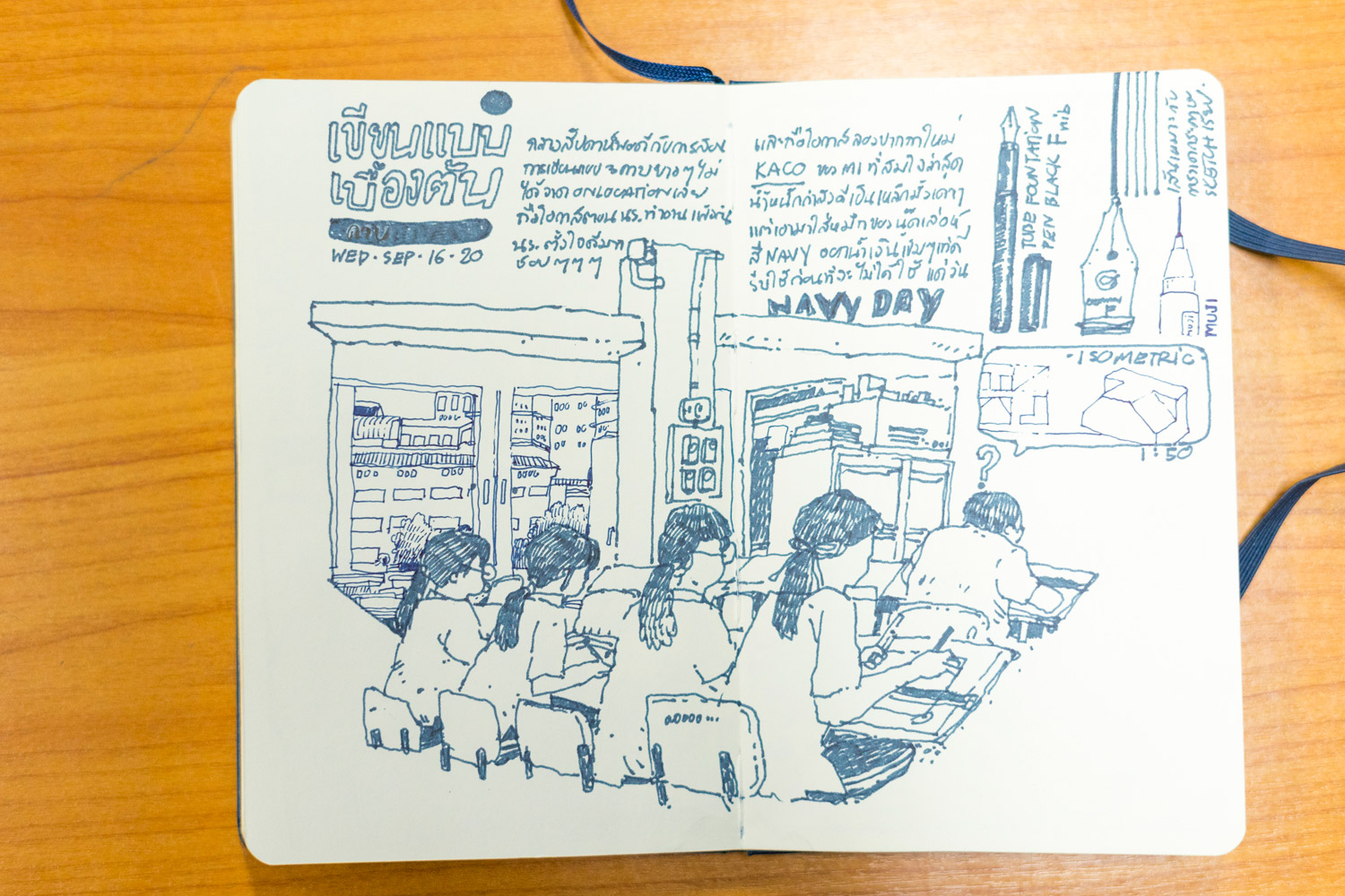 และนี่คือความสุขในการวาดรูปของ โหน่ง - กฤษพล วัฒนปาน ซึ่งก่อนเดินออกจากห้องเรียน เขาหยิบภาพสเก็ตซ์ที่แอบวาดเด็กๆ ขณะกำลังเรียนวิชาเขียนแบบเบื้องต้นมาให้เราดู