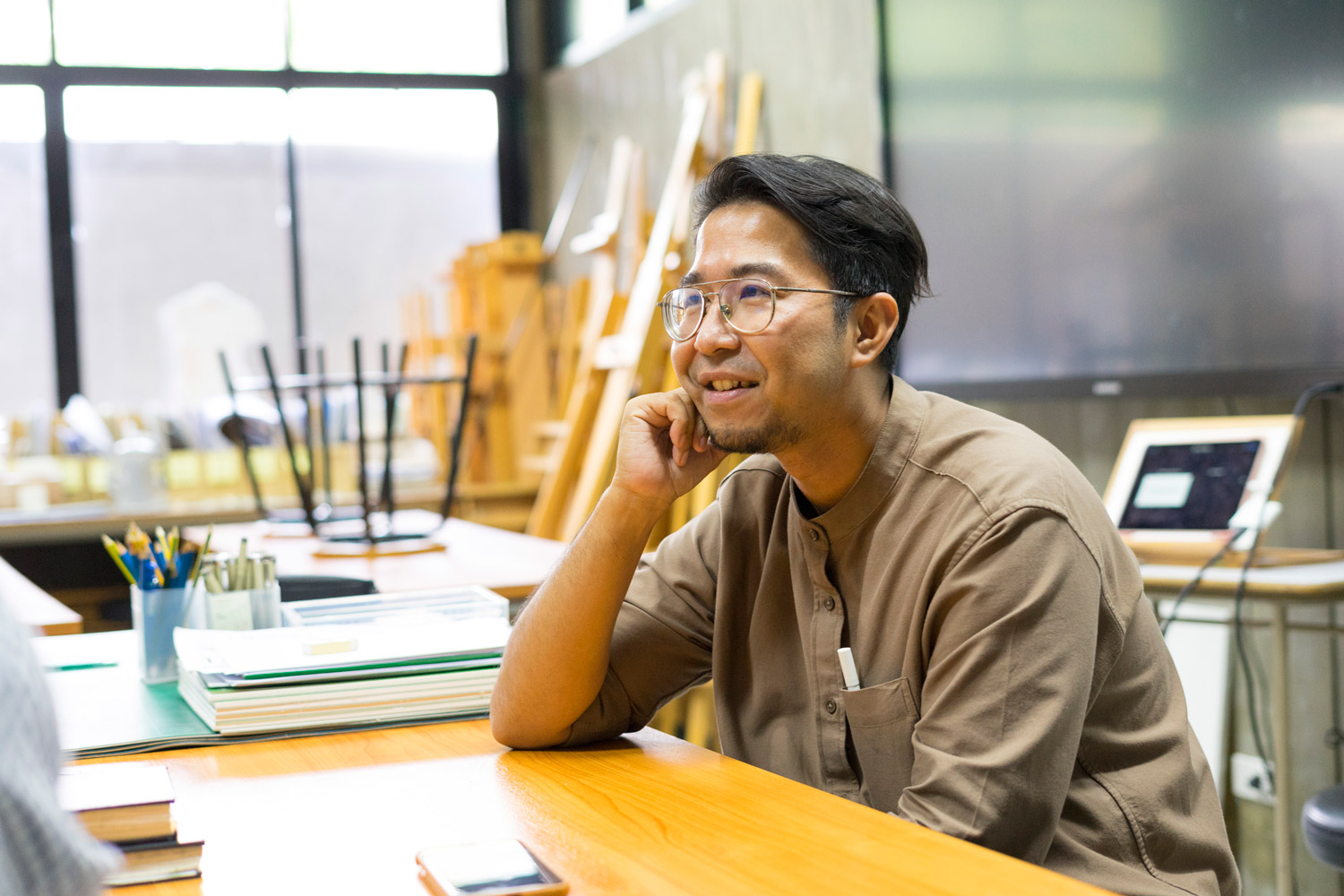 เรานัดคุยกับเขาในห้องเรียนที่ใช้สอนศิลปะ ท่ามกลายกลิ่นอายของกระดาษ สี และแบคกราวน์ผนังที่เป็นผลงานของนักเรียน คือห้องที่หลอมรวมตัวตนของผู้ชายคนนี้ ...ให้รักการสอนศิลปะสุดหัวใจ