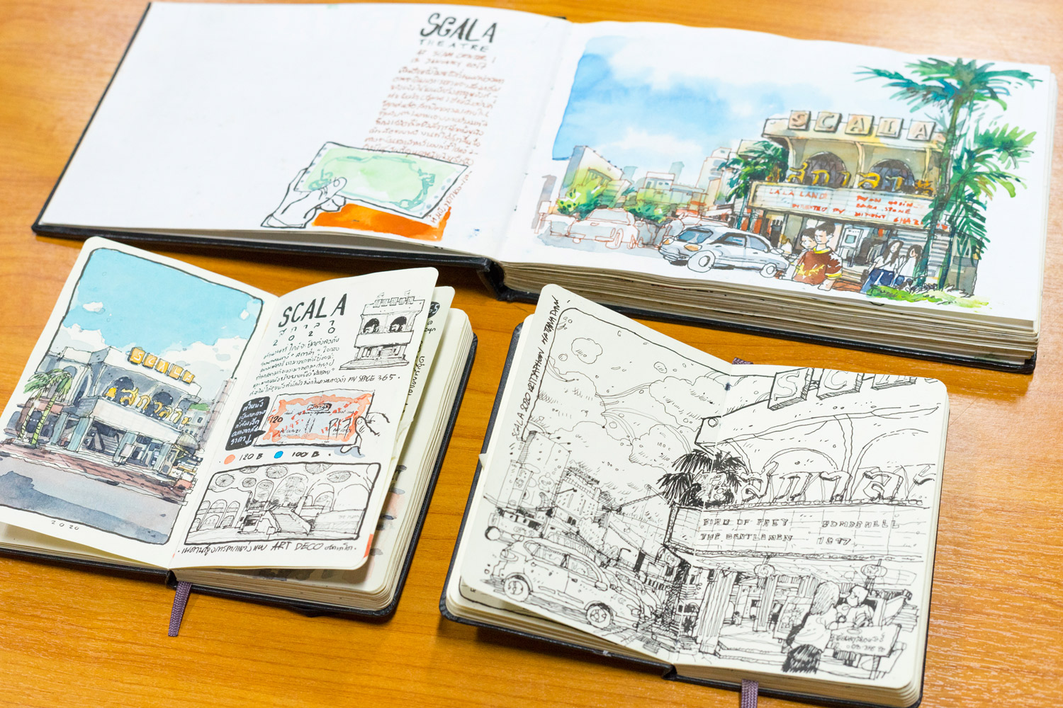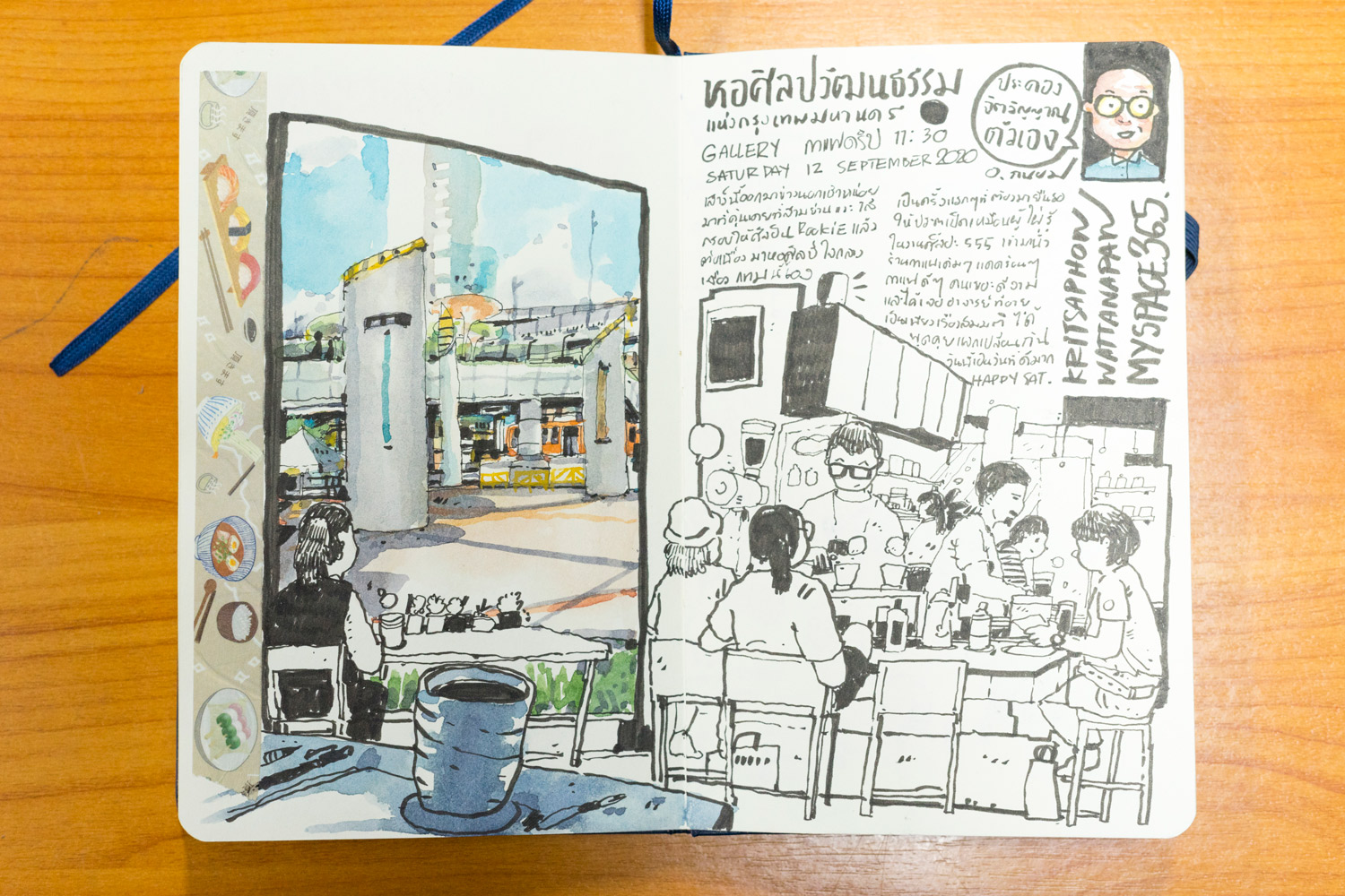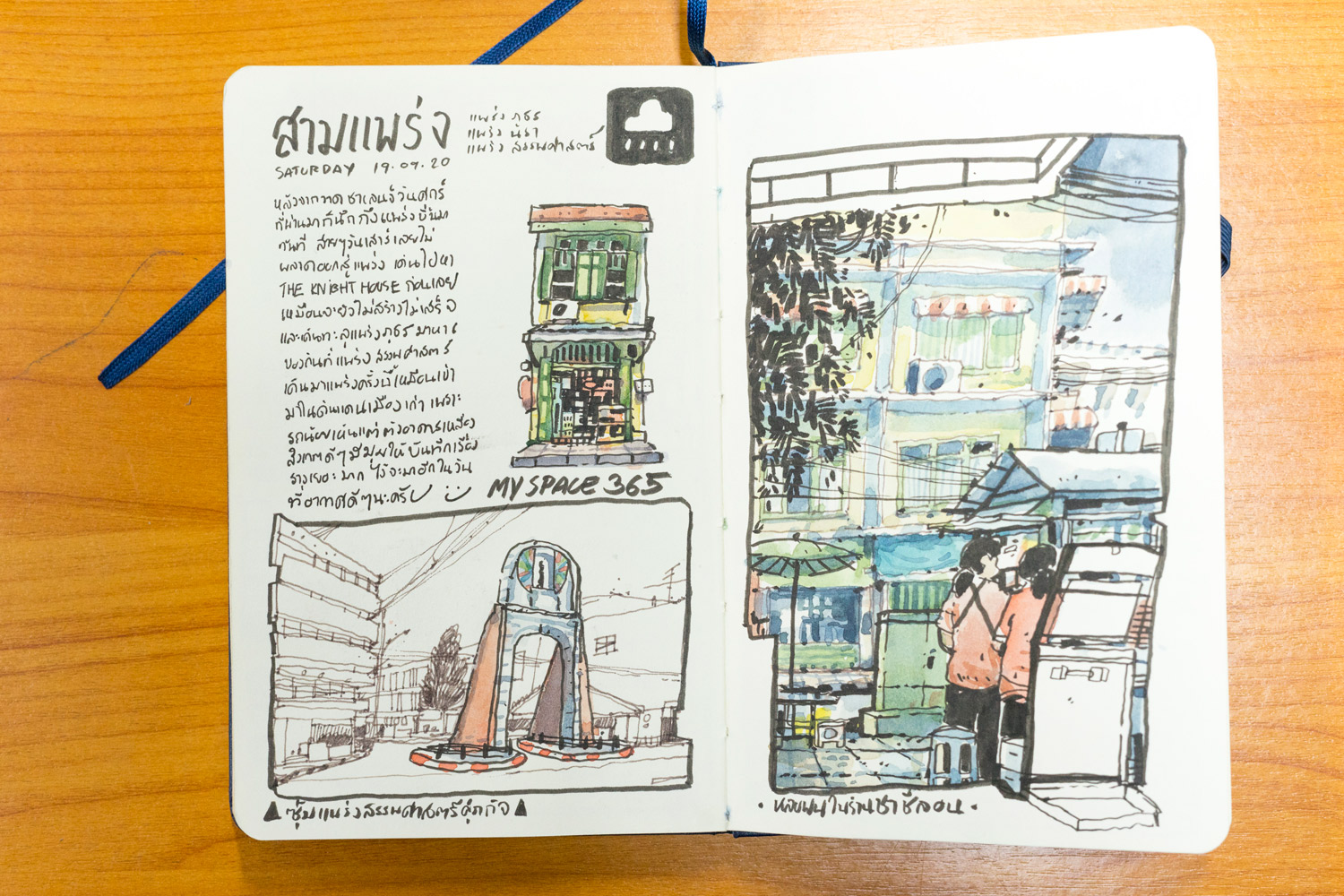"เราได้เพอร์สเปกทีฟมาบ้างแล้ว พอออกไปวาด on location ที่วัดต่างๆ ในพิษณุโลก มันสนุกจัง ดีจังเลย เริ่มชอบการวาดภาพข้างนอก บวกกับต้องไปต่างจังหวัดคนเดียว เลยเขียนไดอารี่เรื่อยๆ เมื่อก่อนเขียนใส่สมุดออร์แกไนซ์ จากเขียนตัวหนังสือเต็มไปหมด ก็เอารูปไปใส่บ้าง พอเห็นว่าตัวเองวาดรูปได้ เลยขยับขยายจากการวาดแทรกเล็กๆ ก็ค่อยๆ ใหญ่ขึ้น เปลี่ยนจากการเขียนมาเป็นรูปวาดแทน เราย้อนกลับไปอ่าน 2-3 ปี หลังจากนั้น รู้สึกจำภาพได้ดีขึ้น มันไม่ได้จำแค่รูปภาพ แต่จำไปถึงบรรยากาศ กลิ่น เสียง เพราะตอนเราวาด เราเก็บรายละเอียดทั้งหมด"