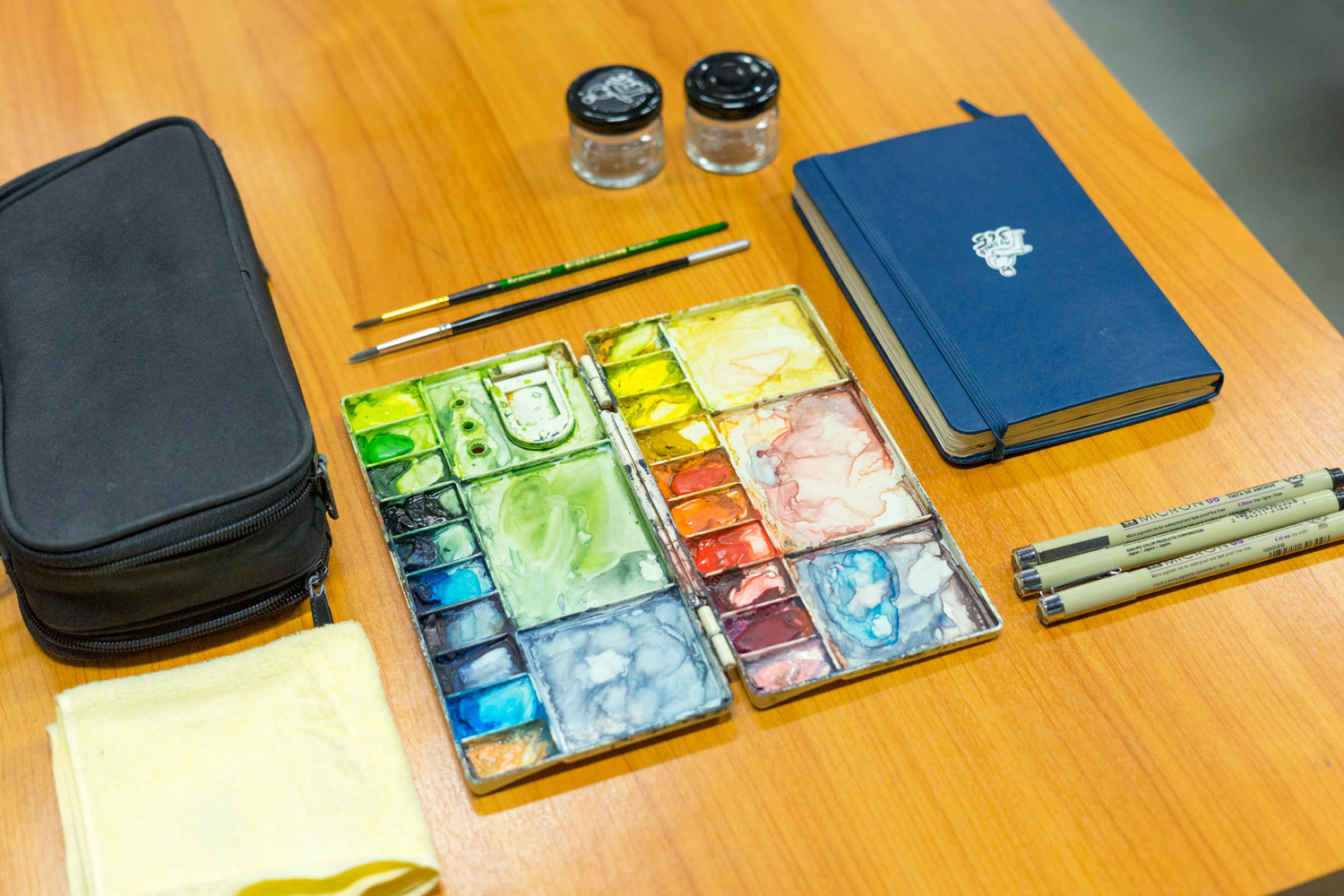 หลังคุยกับโหน่งสักพัก เขาหยิบอุปกรณ์คู่กายของเขามาให้เราดู กระเป๋าเล็กๆ สีดำ ใส่อุปกรณ์ครบครัน ทั้ง กระปุกใส่น้ำ พู่กัน สี ผ้า ปากกาพิกม่า 3 เบอร์ ซึ่งช่วยสร้างลายเส้นให้มีมิติที่หลากหลาย และที่ขาดไม่ได้คือสมุดบันทึกหลายเล่ม ซึ่งเมื่อไล่เรียงดูทีละหน้า จะพบว่า เขามักวาด ตึก อาคาร สถานที่ประวัติศาสตร์ พร้อมเก็บบรรยากาศโดยรอบ เพื่อเชื่อมโยงสถานที่เข้ากับบริบทของสังคม