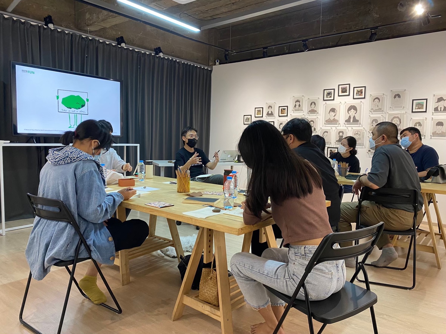 "ปกติแล้วคอร์สนี้จะเป็นเวิร์กช้อป มีบรรยาย มีแลกเปลี่ยนทุกวันเสาร์ แต่ระหว่างสัปดาห์ นักวาดที่มาร่วมเรียนกับเราก็อาจจะทำอะไรทิ้งไว้หรือแม้กระทั่งเขาอาจจะมาเติมต่อในระหว่างวันธรรมดาก็ได้ มันกลายเป็นพื้นที่ที่เขาใช้ได้ และในแต่ละสัปดาห์งานที่จัดแสดงรอบๆ ห้องเรียนของเราก็จะเปลี่ยนไปตามสิ่งที่เกิดขึ้น และเสาร์สุดท้ายเราก็จะจัดนิทรรศการแสดงถึงกระบวนการเรียนรู้ของพวกเขาด้วยค่ะ"