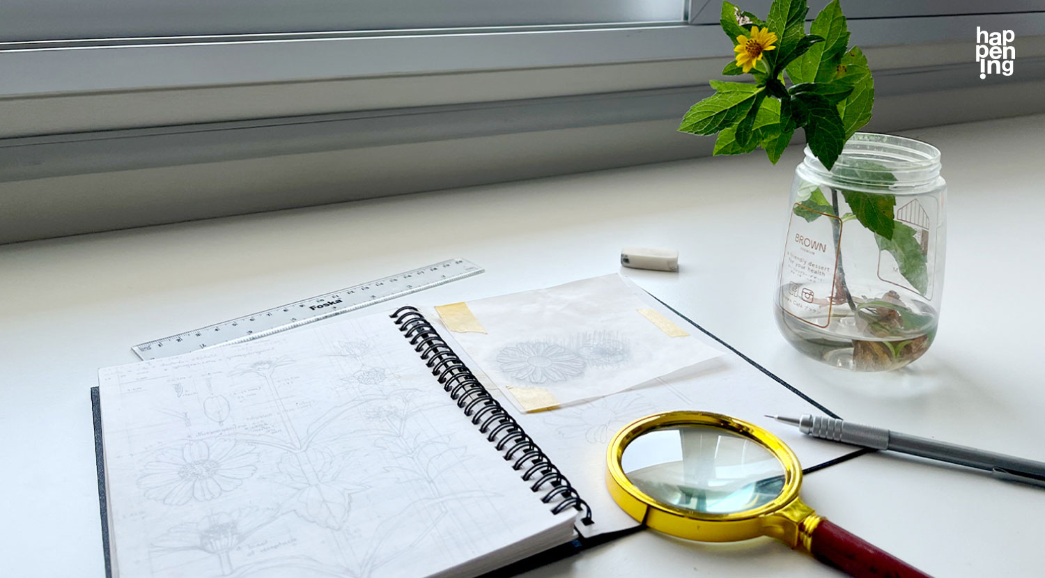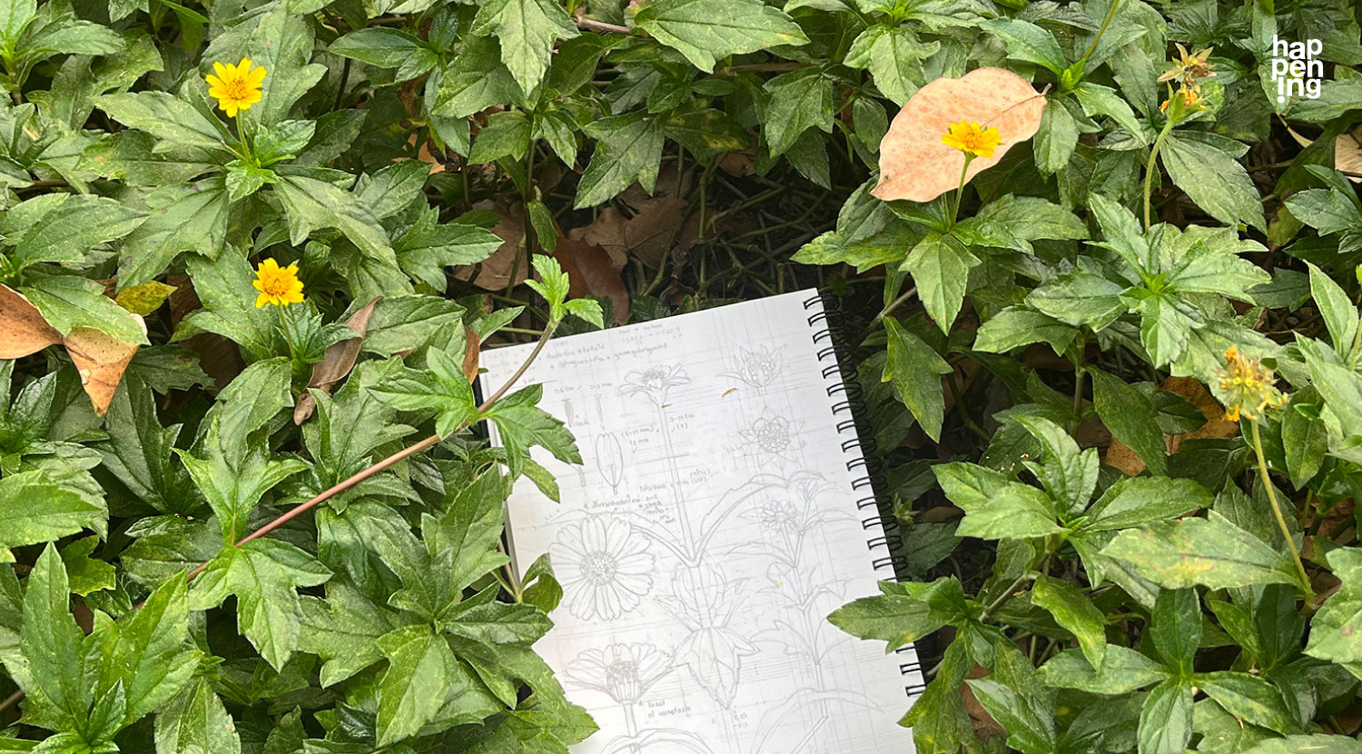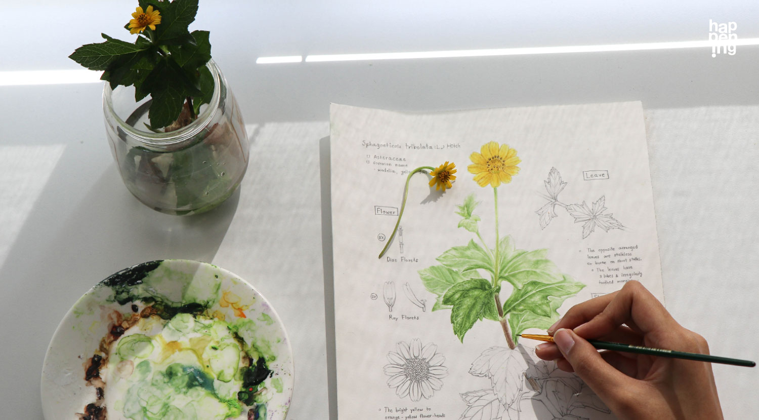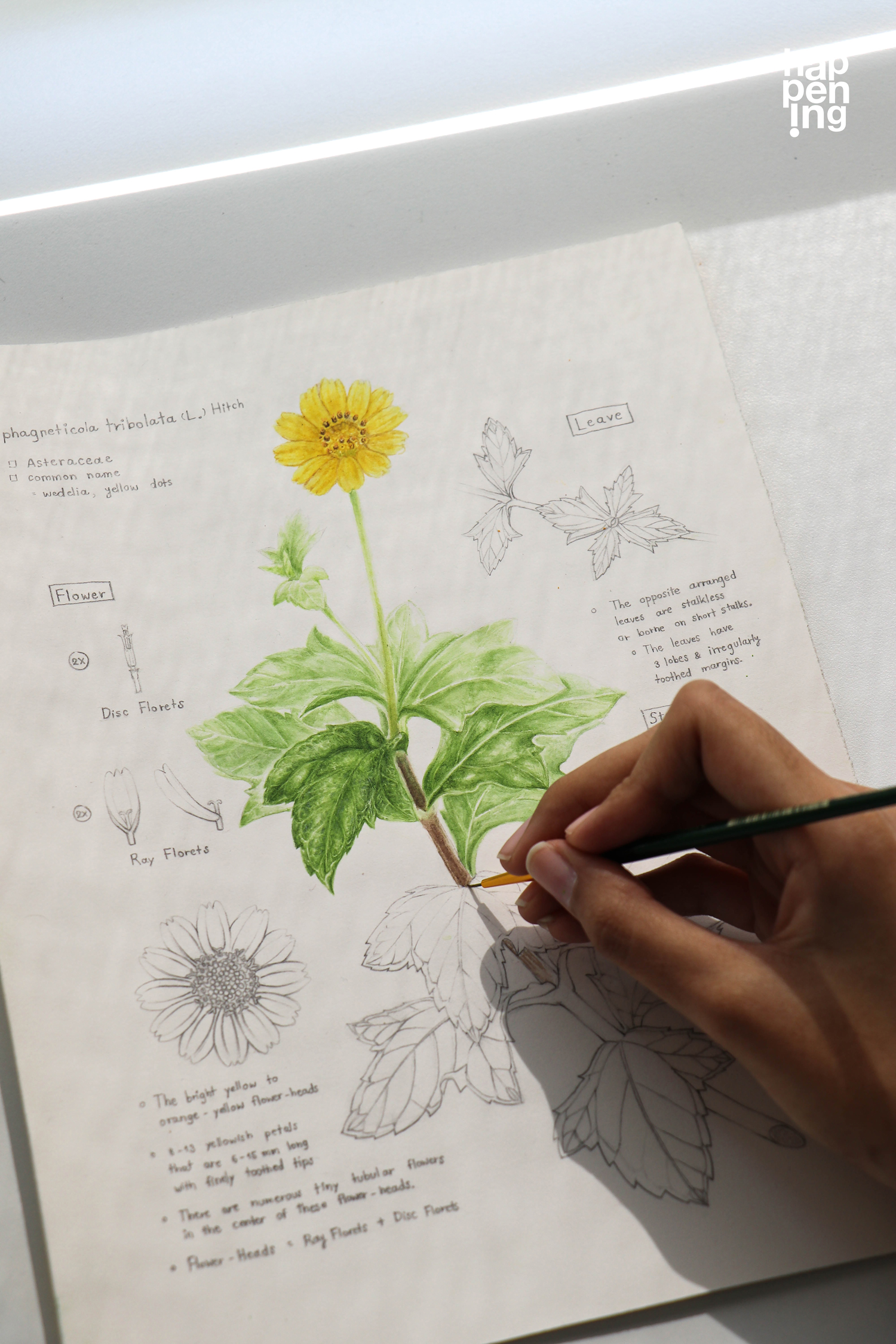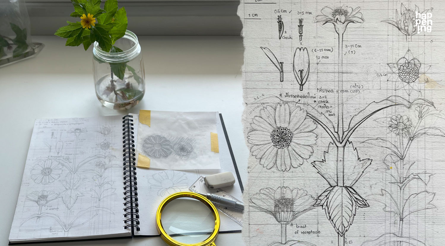 พอศึกษาเรื่องนี้มากๆ เข้า ผลงานภาพวาดทางพฤกษศาสตร์ที่สวยงามก็ดึงดูดให้เราสนใจและเข้าถึงความมหัศจรรย์ของพืช และกลายเป็นแรงบันดาลใจให้เราเริ่มศึกษาวิธีการวาดภาพทางพฤกษศาสตร์ด้วยตัวเองบ้าง เราตัดสินใจเลือก กระดุมทอง ซึ่งเป็นพืชไม้เลื้อย มีดอกสีเหลืองขนาดเล็กน่ารัก สามารถพบเห็นได้ทั่วไปและออกดอกตลอดทั้งปี มาเป็นตัวอย่างในการลองวาดภาพทางพฤกษศาสตร์ดูสักครั้ง