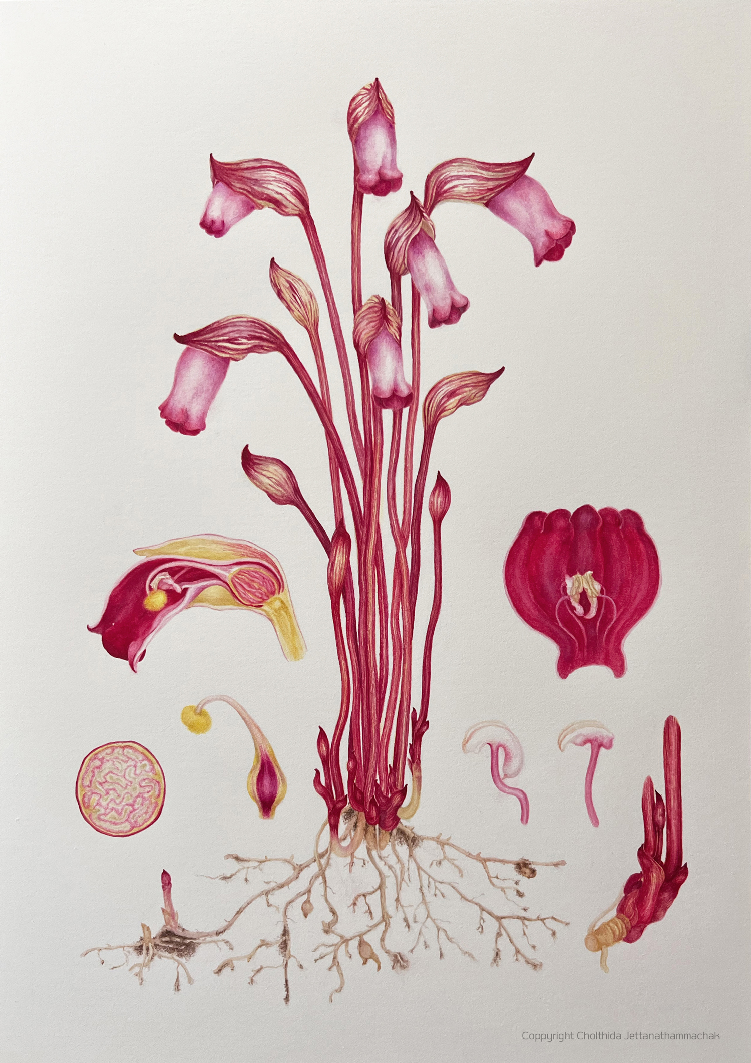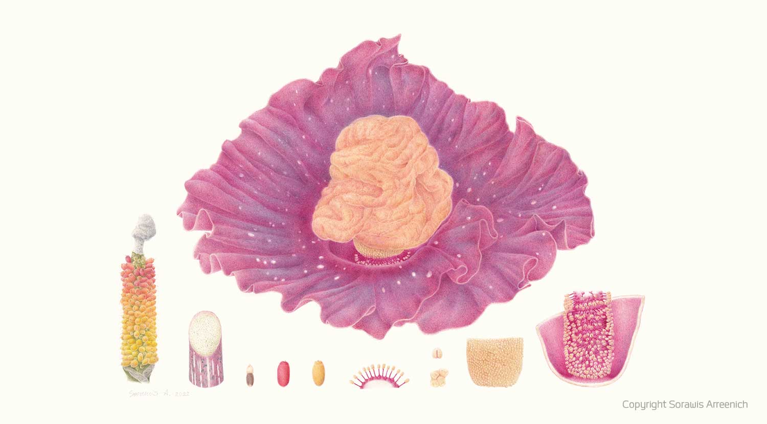 ส่วนอีกภาพที่เราอยากเอามาให้ชมกัน คือภาพ บุกบางกอก ไม้ล้มลุกที่มีถิ่นกำเนิดในประเทศไทย ซึ่งมีดอก ผล เกสร ภาพตัด เมล็ด และก้าน เป็นองค์ประกอบในภาพ เป็นผลงานของ สรวิศ อารีนิจ ผู้สนใจภาพวาดทางพฤกษศาสตร์จากการอ่านหนังสือภาพประกอบที่เกี่ยวกับต้นไม้และสัตว์ตั้งแต่เด็ก ในช่วงที่เขากำลังศึกษาอยู่ในคณะสถาปัตยกรรมศาสตร์ สาขาสถาปัตยกรรมภายใน สถาบันเทคโนโลยีพระจอมเกล้า เจ้าคุณทหารลาดกระบัง มีโอกาสเรียนวิชาเลือกเกี่ยวกับพรรณไม้ต่างๆ ทำให้เขาเริ่มศึกษาพืชชนิดต่างๆ อ่านบทความวิจัย ทดลองปลูกด้วยตัวเอง แล้วฝึกฝนเพื่อเป็นศิลปินนักวาดภาพพฤกษศาสตร์อิสระควบคู่กับการทำงานเป็น นักออกแบบครัว (Kitchen Designer) ไปพร้อมๆ กัน