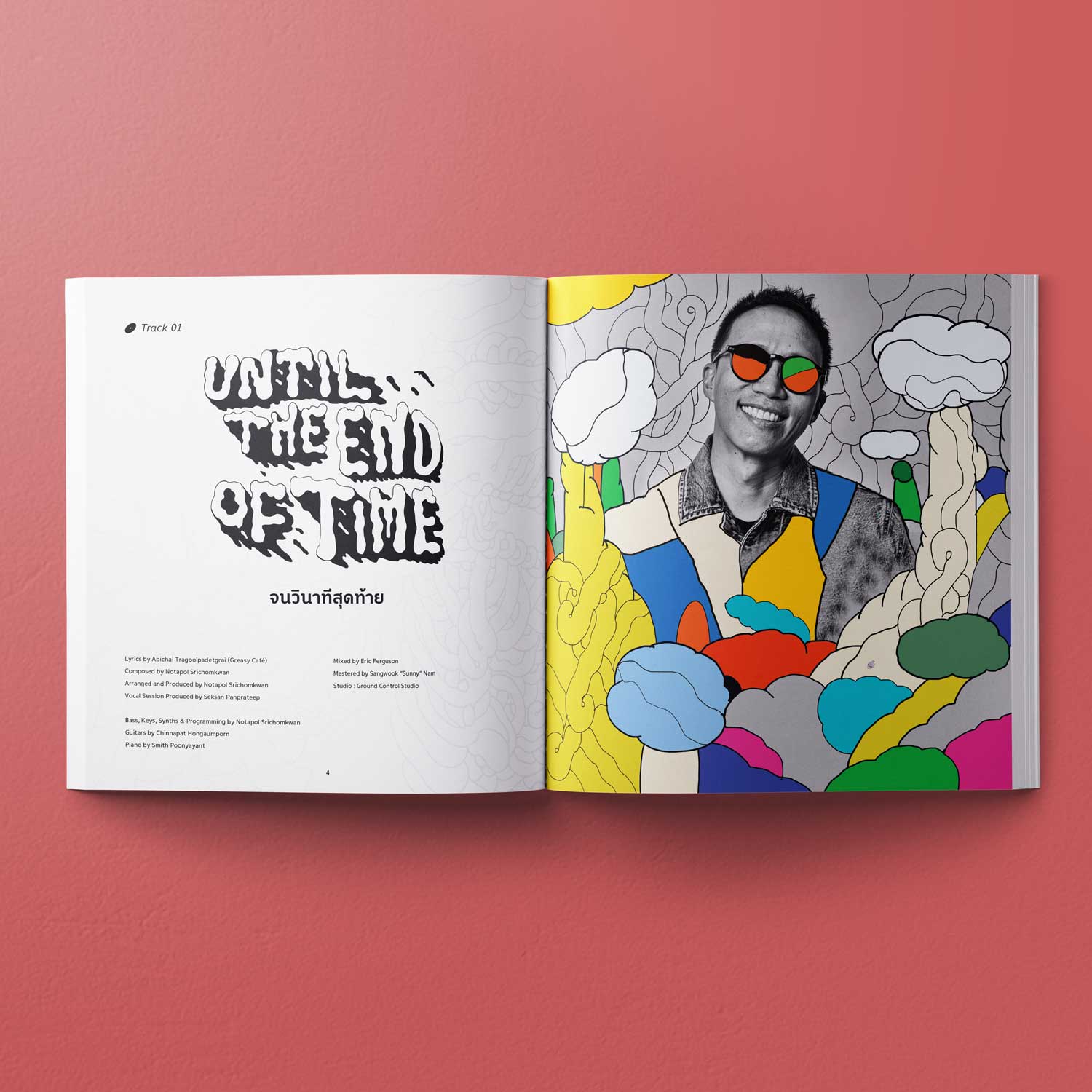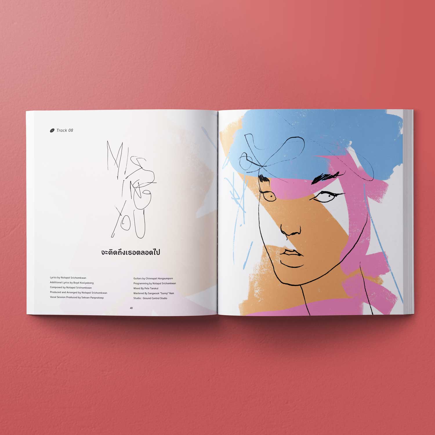 งานด้านภาพในอัลบั้มเล่มนี้ ไม่ได้ทำหน้าที่เป็นเพียงองค์ประกอบประกอบเพลงเท่านั้น หากคืออีกหนึ่งภาษาในการเล่าเรื่อง แต่ละบทเพลงถูกแปลความออกมาเป็นเส้น สี และจังหวะของภาพที่แตกต่างกัน ผ่านกระบวนการรับฟังอย่างลึกซึ้ง จากการที่ก้อเล่าถึงที่มา ความหมาย และแรงบันดาลใจของเพลง ก่อนจะถูกถ่ายทอดออกมาเป็นงานภาพที่ค่อยๆ พัฒนาและแลกเปลี่ยนกันทีละเพลง โปรเจกต์ที่เริ่มต้นเมื่อราว 5 ปีก่อน จากภาพวาดทดลองเส้นหมุนไปหมุนมาบนภาพถ่าย ได้ต่อยอดจนกลายเป็นมิวสิกวิดีโอ จนวินาทีสุดท้าย และขยายขอบเขตออกเป็นโลกภาพของทั้งอัลบั้ม