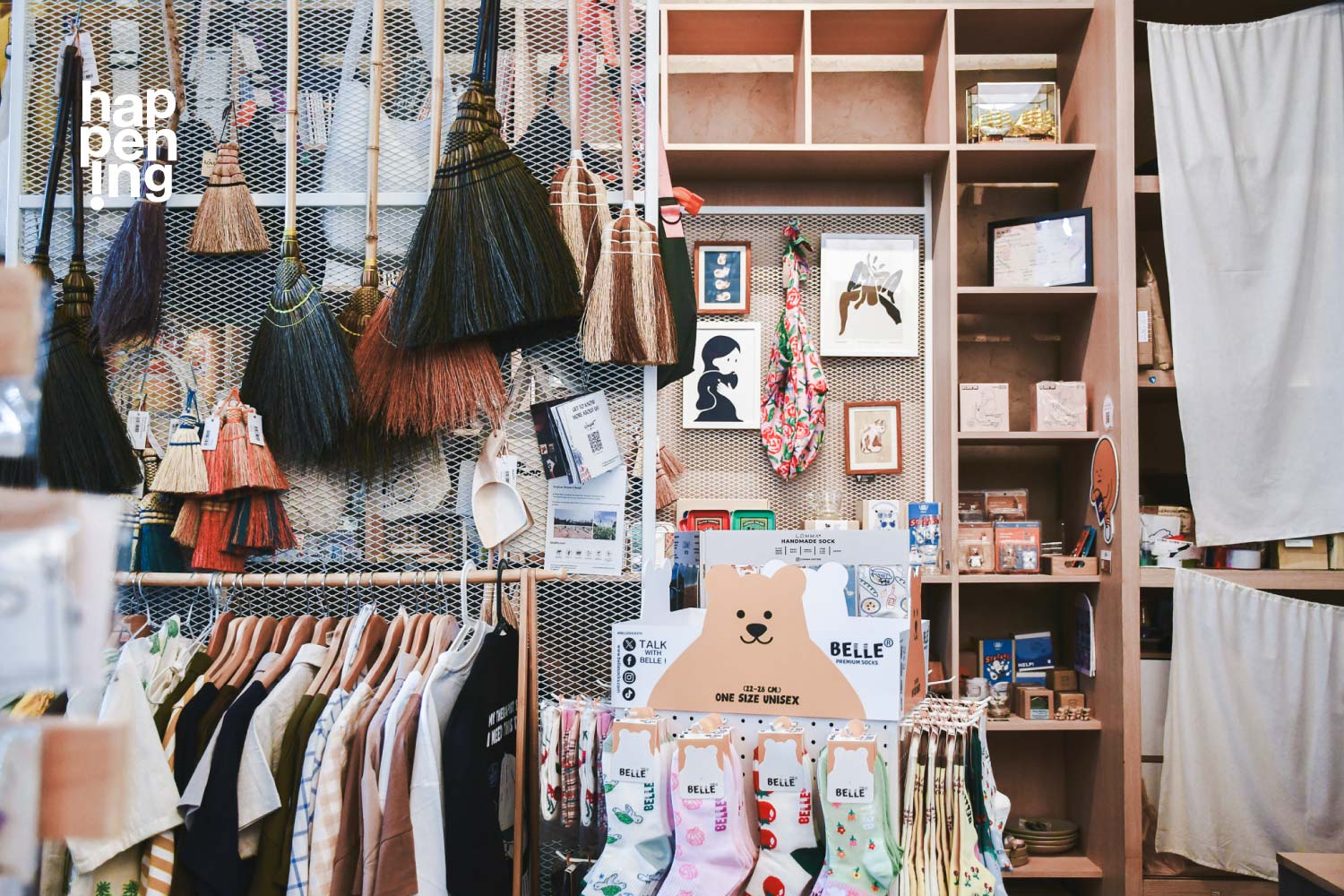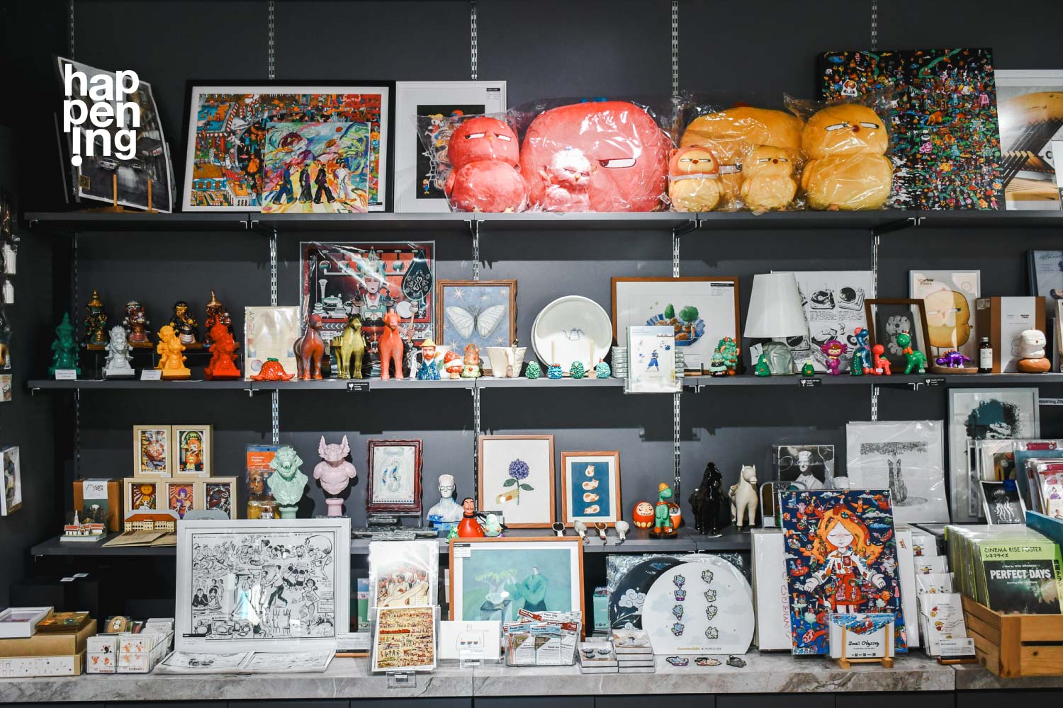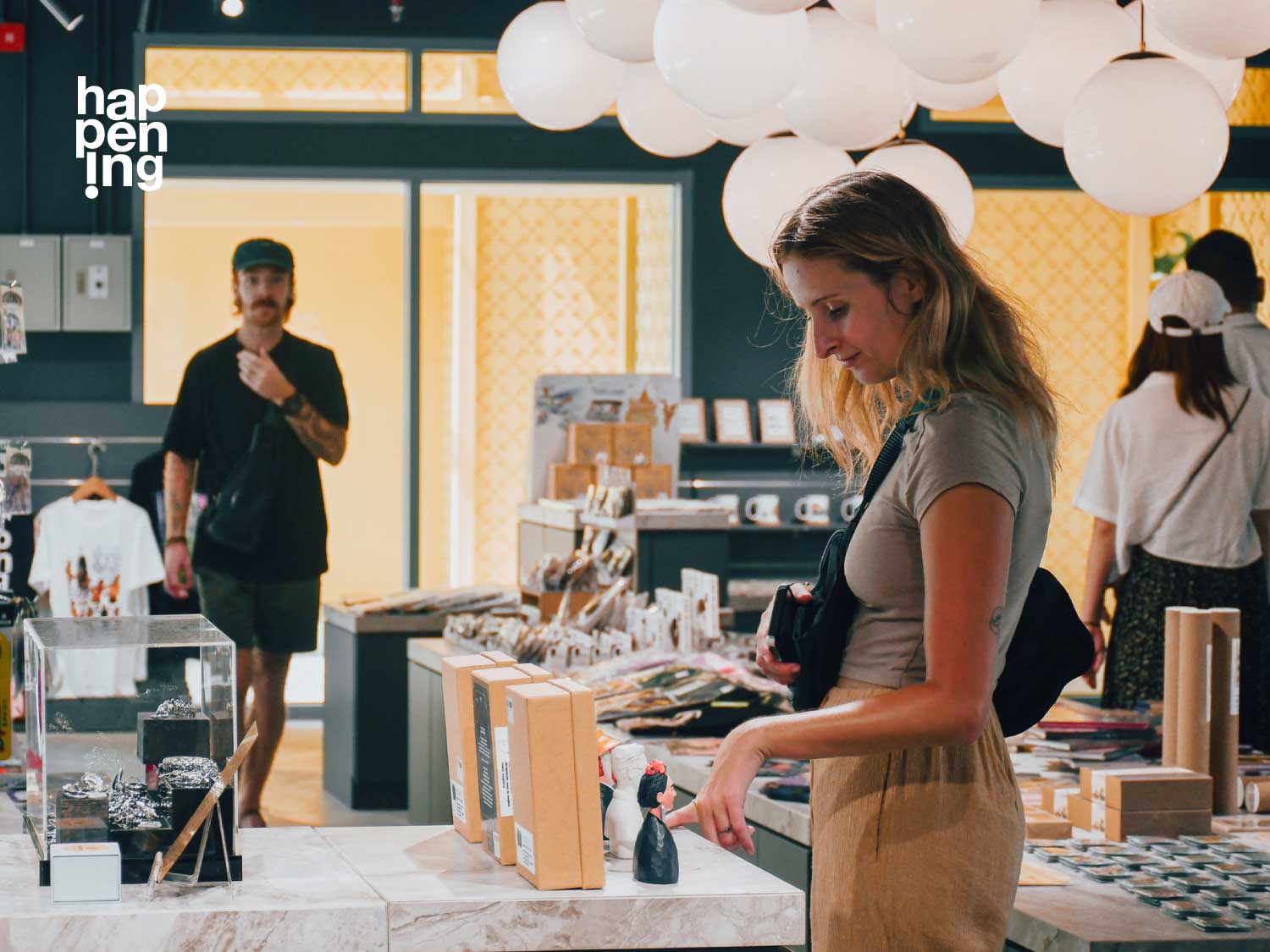 happening shop สาขาหอศิลปกรุงเทพฯ มีโคมไฟกลมกลางร้านส่องแสงอบอุ่นเป็นเอกลักษณ์ ด้วยความเชื่อว่าศิลปะเป็นเรื่องสำคัญ ทีมร้านจึงคัดสรรผลงานของศิลปินและแบรนด์ดีไซน์จากนักออกแบบที่น่าสนใจ ซึ่งล้วนส่งต่อความคิดสร้างสรรค์ ส่งความรู้สึกที่ดีทางใจ หรือเป็นของขวัญแทนความรู้สึกถึงกันได้