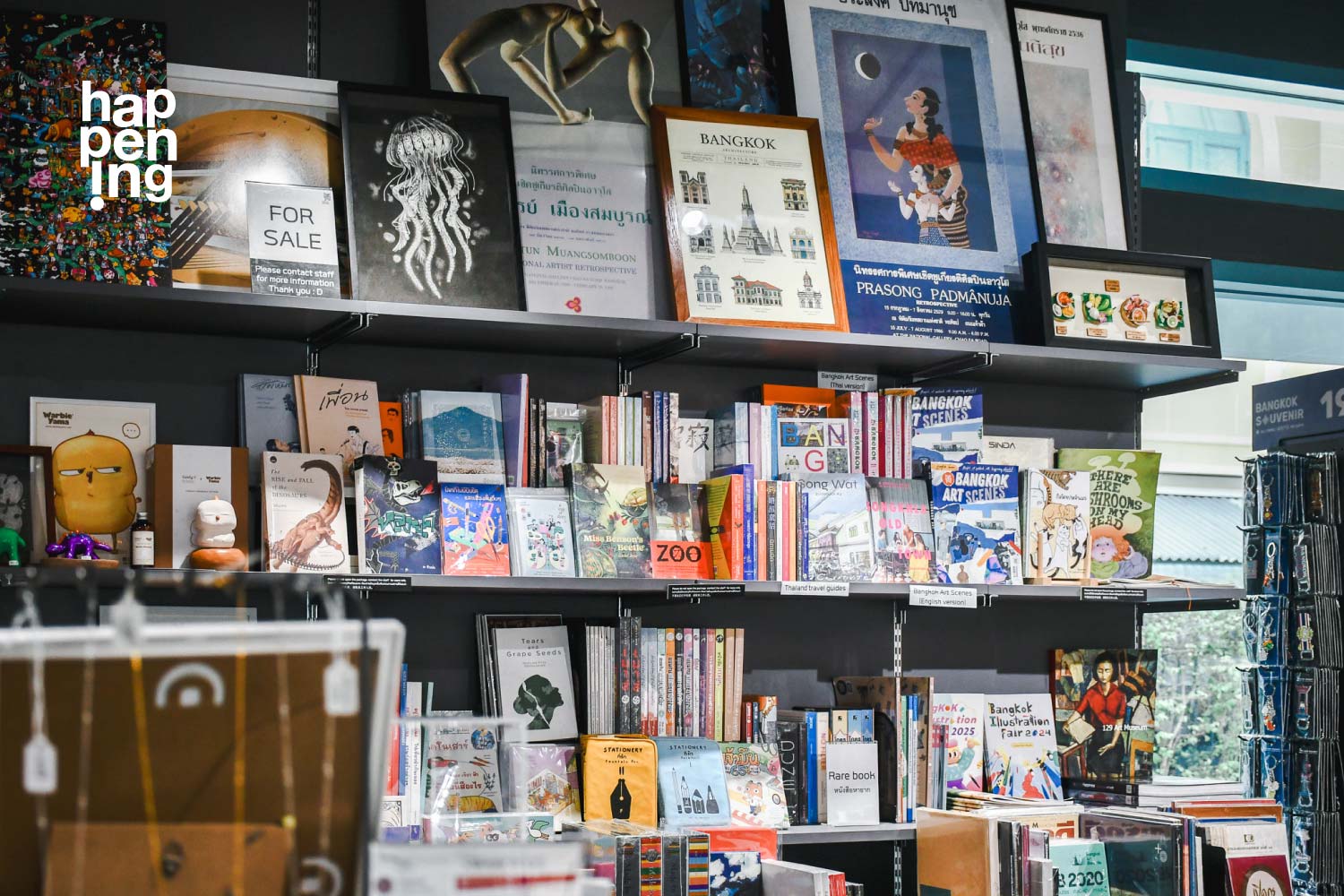สิ่งที่พิเศษสุดๆ คือ happening shop สาขาท่าพิพิธภัณฑ์ มีหนังสือศิลปะที่หากยากทั้งของไทยและต่างประเทศมาจำหน่าย บางเล่มเป็นหนังสือที่คนรักศิลปะซื้อเก็บสะสมไว้จึงหาจากที่ไหนไม่ได้อีกแล้ว ไปจนถึงหนังสือที่รวมผลงานของศิลปินชั้นครูให้ผู้ที่สนใจศึกษาสามารถแวะมาเสาะหาได้ที่นี่