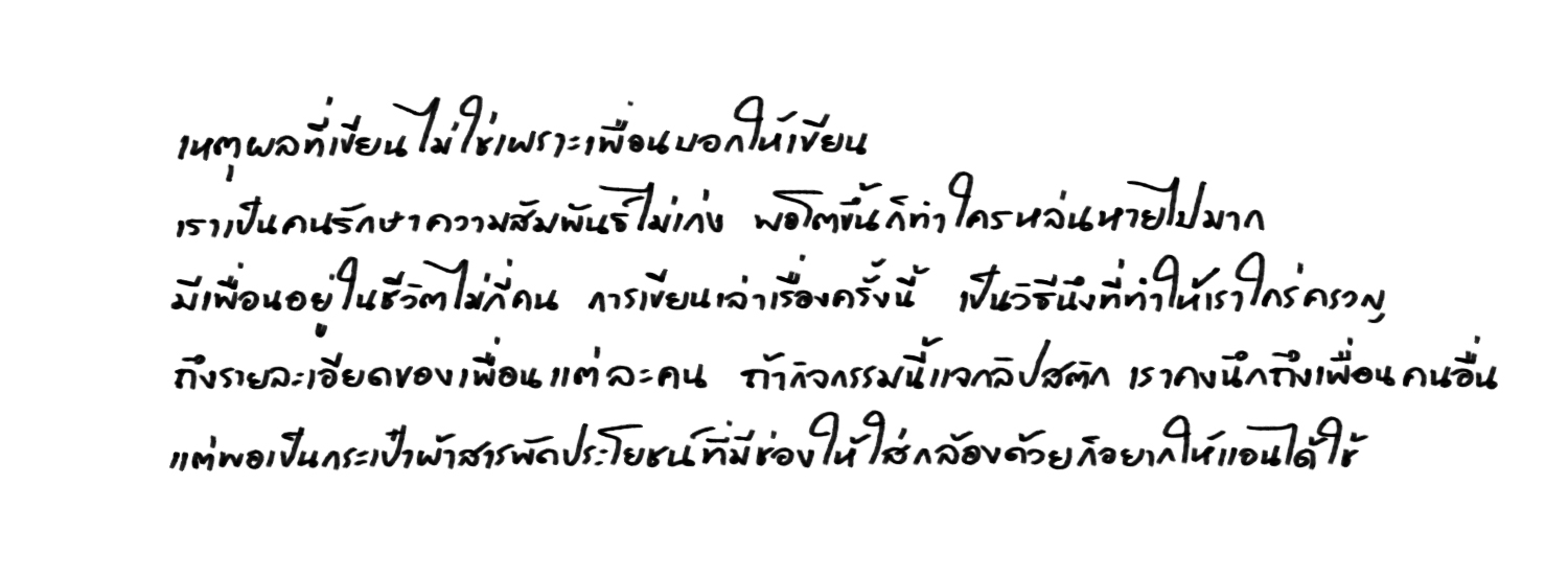 ย่อหน้าข้างบนคือย่อหน้าแรกๆ ในอีเมลที่ 'แตง' ส่งถึงเมลบ็อกซ์ของทีมงาน มันตรึงให้เราอยากอ่านบรรทัดถัดไปและถัดไปเรื่อยๆ อาจเป็นเพราะแตงบอกเราว่าเธอกับเพื่อนชอบอ่านหนังสือและเริ่มต้นมิตรภาพผ่านแผ่นกระดาษก็ได้มั้ง ที่ทำให้เรารู้สึกสนใจเป็นพิเศษ มิตรภาพระหว่างคนรักกระดาษ ภาพถ่าย และการอ่านการเขียน มันน่ารักและคลาสสิกดีจัง