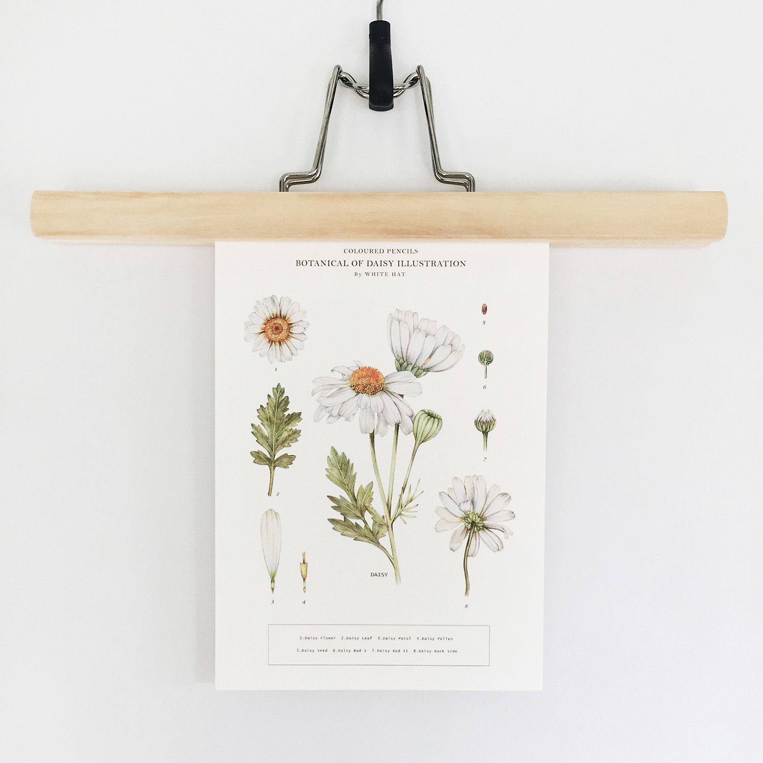 เป็น Art Printed ภาพส่วนประกอบทางพฤกษศาสาตร์ของดอกเดซี่ ด้วยเทคนิคการวาดมือด้วยลายเส้นสีไม้ ขนาด A5