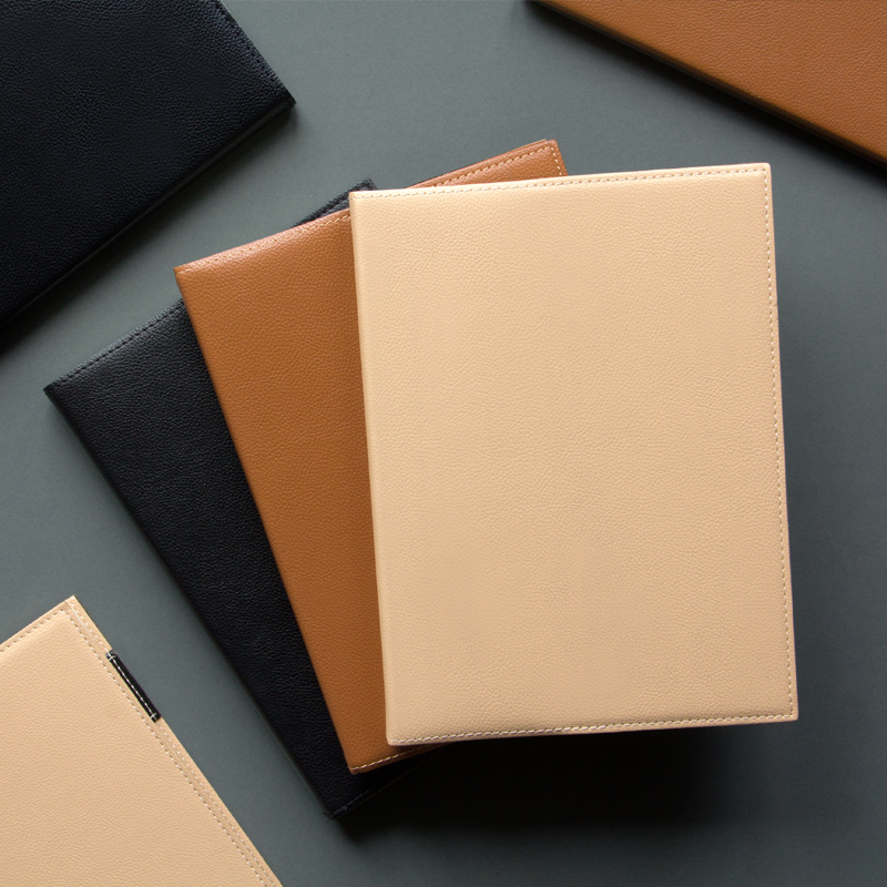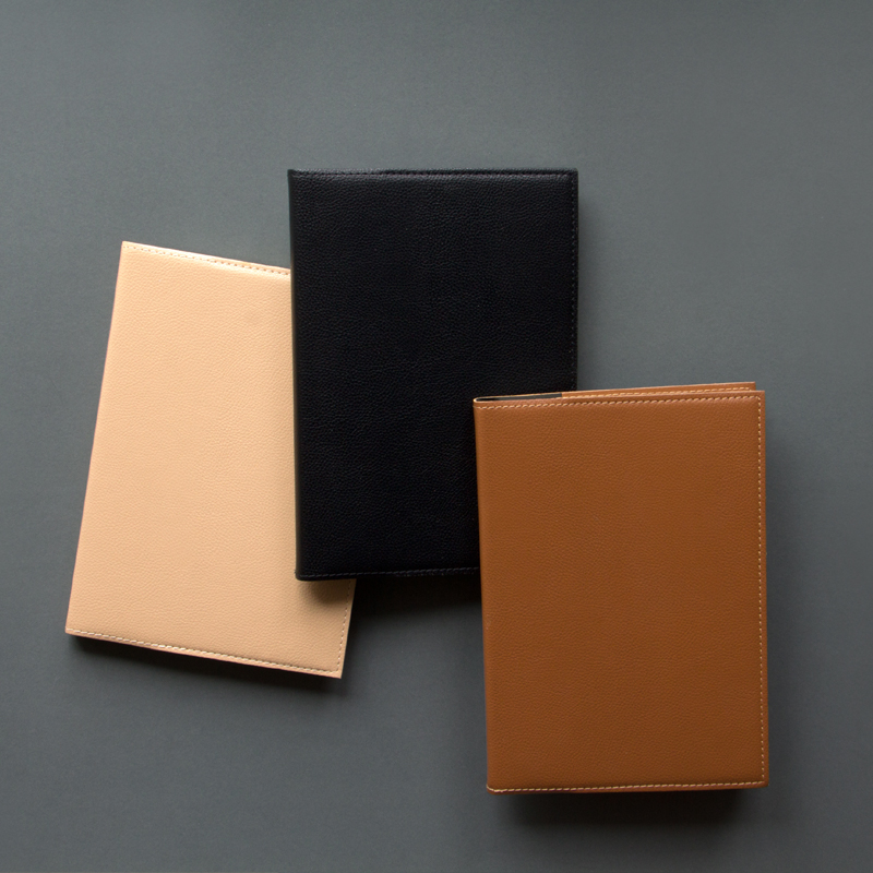 เข้าเล่มเย็บกี่ไสกาว กางได้ 180 องศา ปกหนังเทียม ขนาด 12.8 x 18.2 ซม. มีทั้งหมด 3 สีเบจ สีน้ำตาล สีดำ