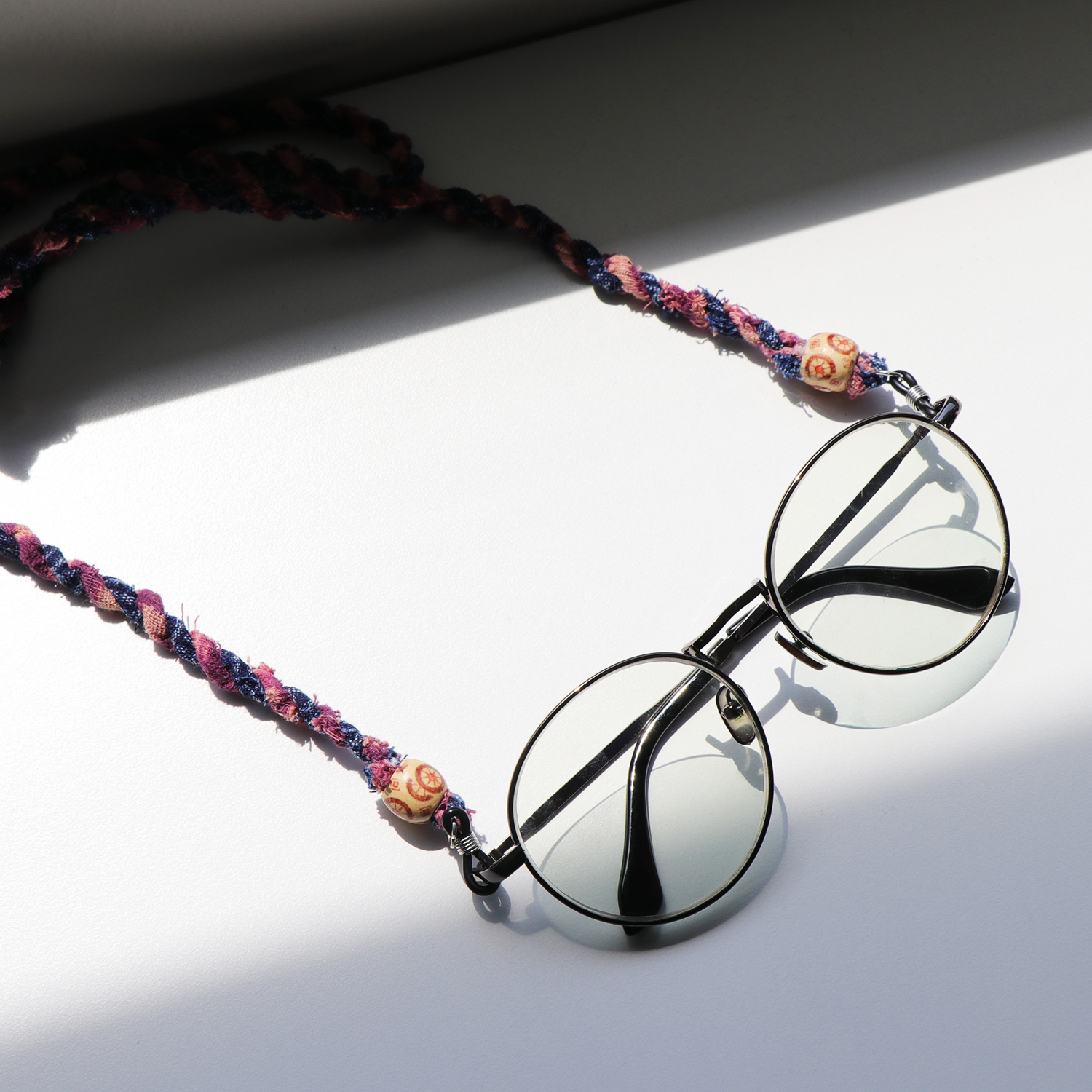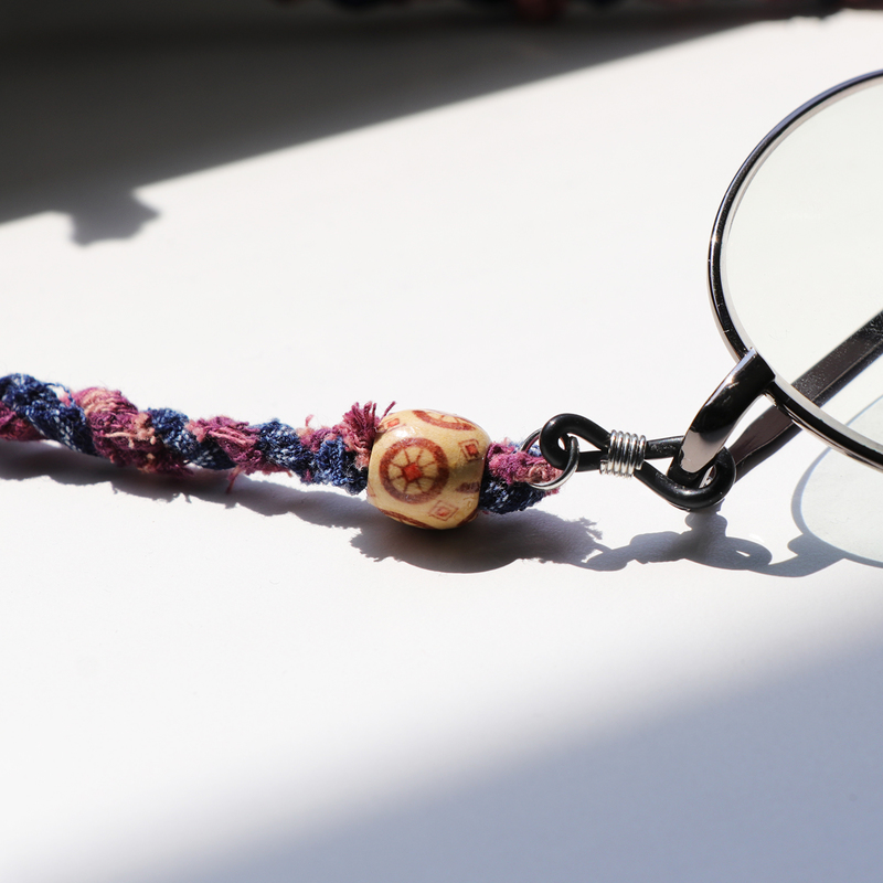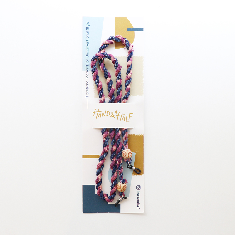 สายคล้องแว่นถักมือจากผ้าทอพื้นบ้าน สีชมพู-คราม โดยแบรนด์ hand and a half แบรนด์สัญชาติไทยที่สร้างสรรค์ขึ้นจากความตั้งใจที่จะนำเอาภูมิปัญญาพื้นบ้านของไทยมาทำเป็นสินค้าแฟชั่น
