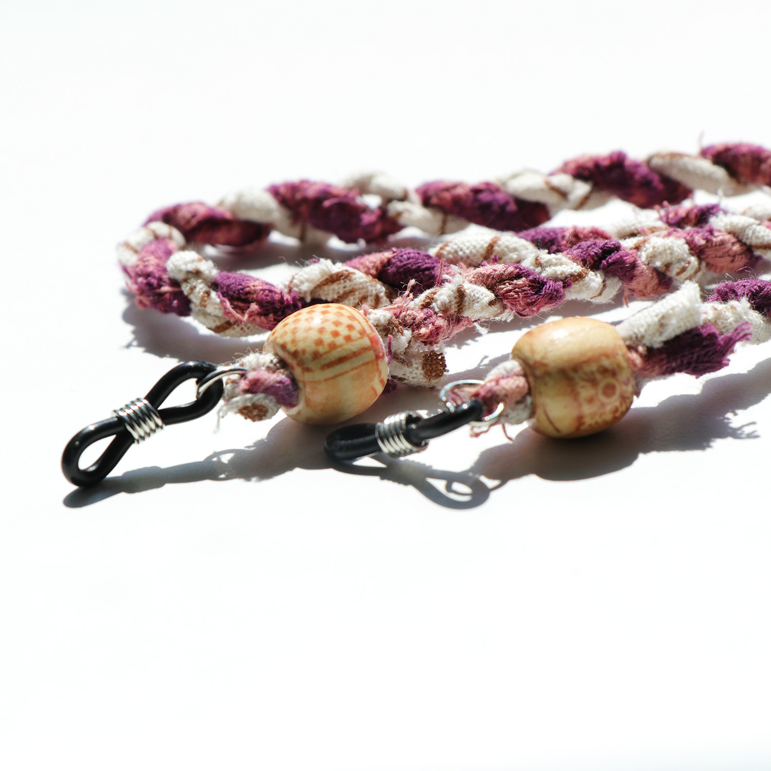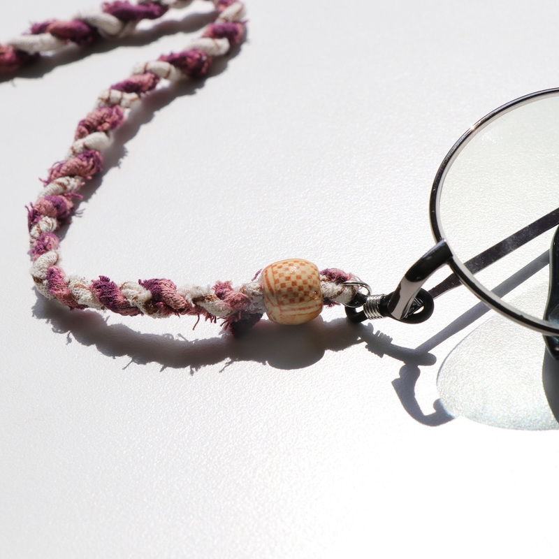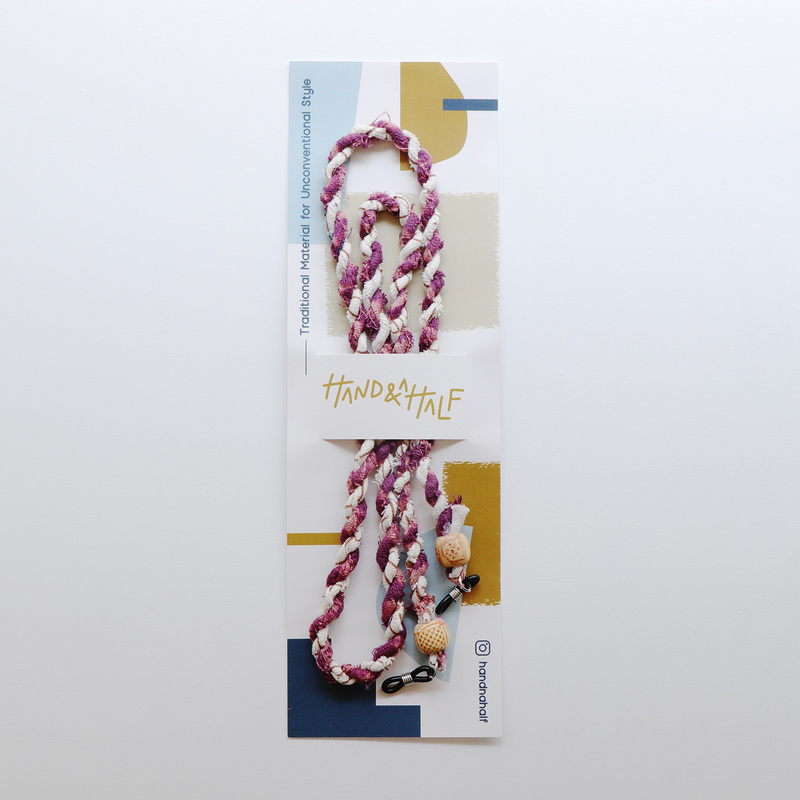 สายคล้องแว่นถักมือจากผ้าทอพื้นบ้าน สีชมพู-ขาว โดยแบรนด์ hand and a half แบรนด์สัญชาติไทยที่สร้างสรรค์ขึ้นจากความตั้งใจที่จะนำเอาภูมิปัญญาพื้นบ้านของไทยมาทำเป็นสินค้าแฟชั่น
