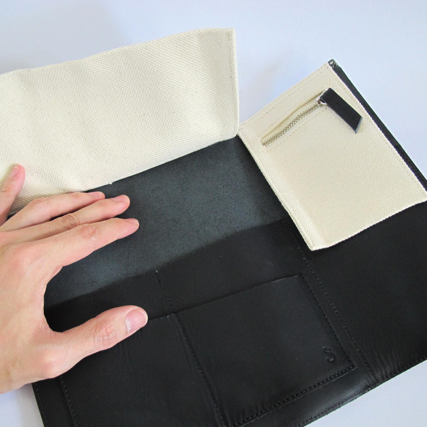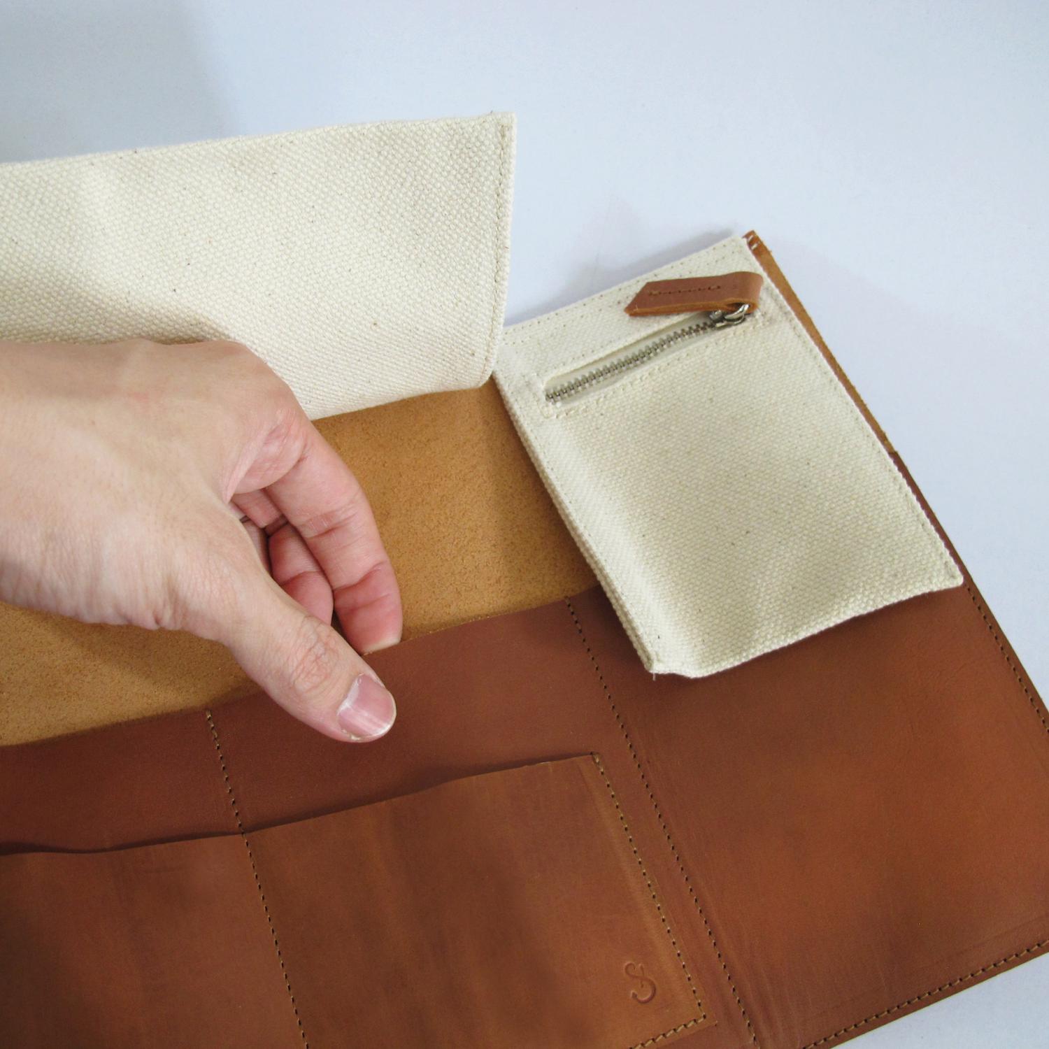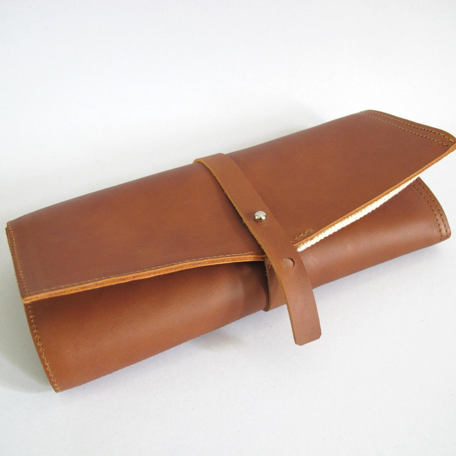 กระเป๋าใส่ของอเนกประสงค์ทำจากหนังวัวฟอกฝาดแท้ และผ้าแคนวาสแบบหนา (สีน้ำตาลและดำ) ทรงม้วนแล้วล็อคด้วยการพันสายหนังและมีซิปด้านใน