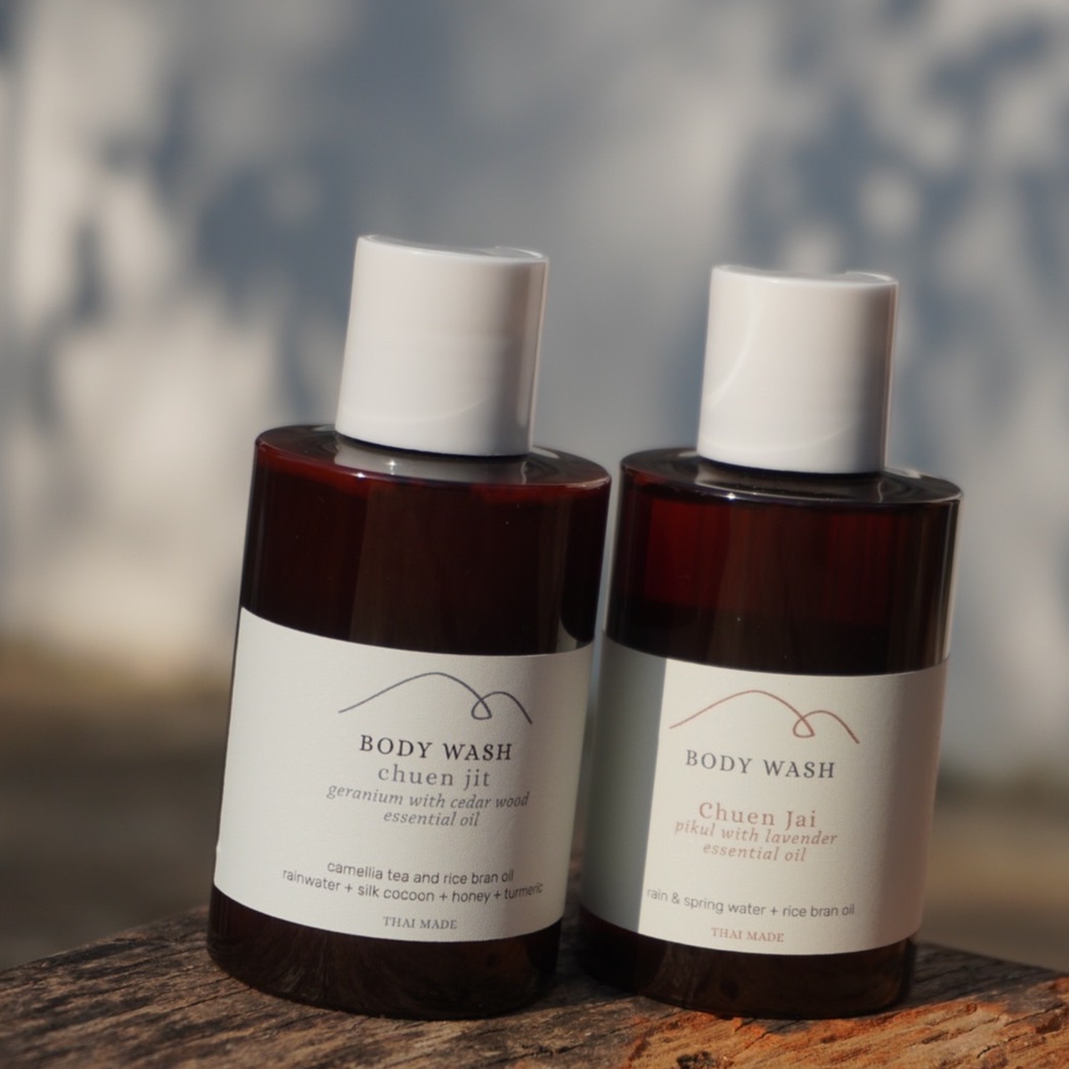 สบู่เหลวอาบน้ำ "ชื่นจิต" (ผ่อนคลาย) 150 มล. กลิ่นของเปลือกไม้พันธุ์ไม้ในป่า และพรรณไม้ในสวนป่า อย่างซีดาร์วู้ด เจอเรเนียม กำยาน และยูคาลิปตัส ให้ความรู้สึกผ่อนคลาย ก่อเกิดอารมณ์ที่สมดุล