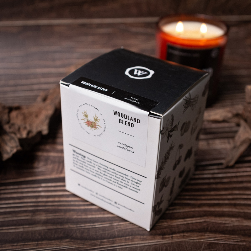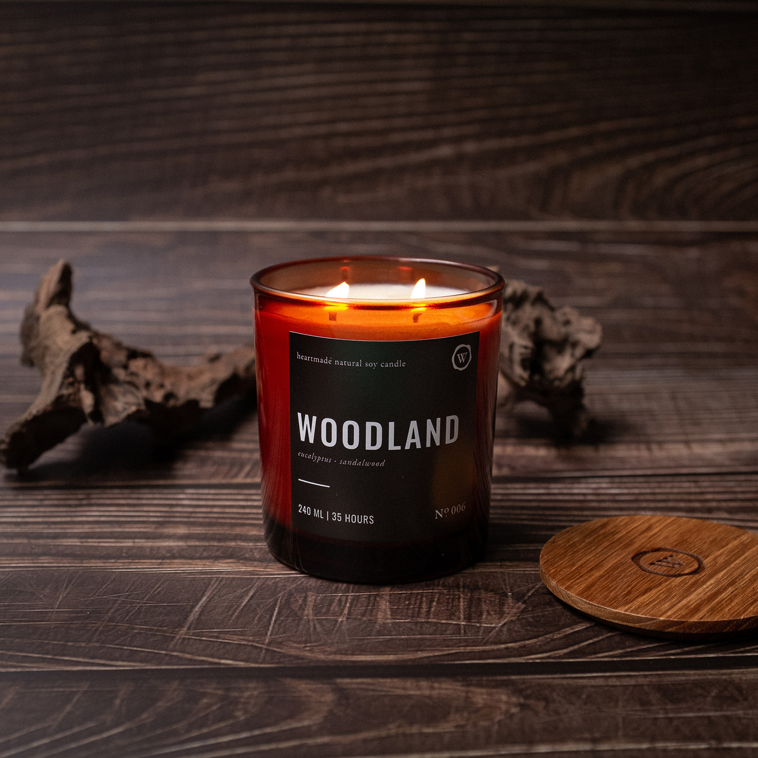 เทียนไขถั่วเหลืองธรรมชาติ กลิ่น Woodland ขนาด Amber Jar ส่วนผสมระหว่างยูคาลิปตัส และไม้จันทน์เพื่อสร้างบรรยากาศป่าไม้