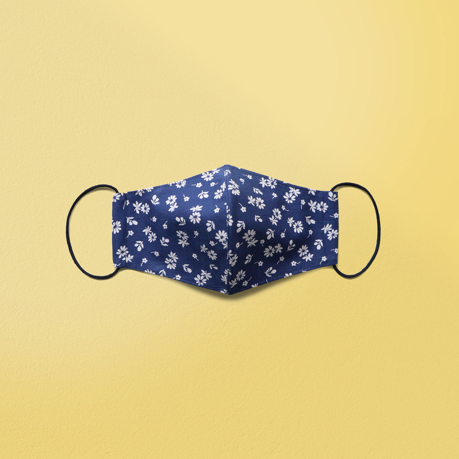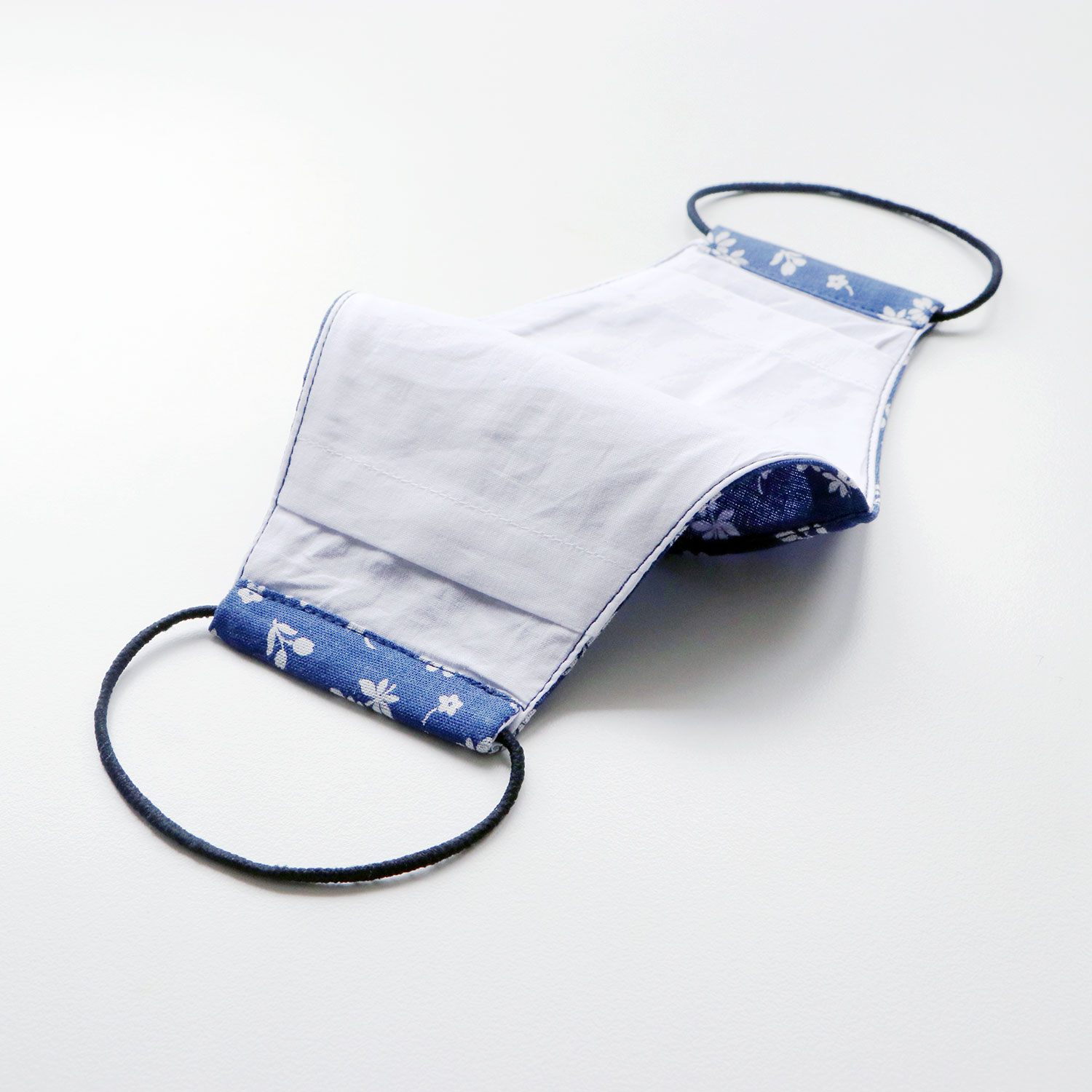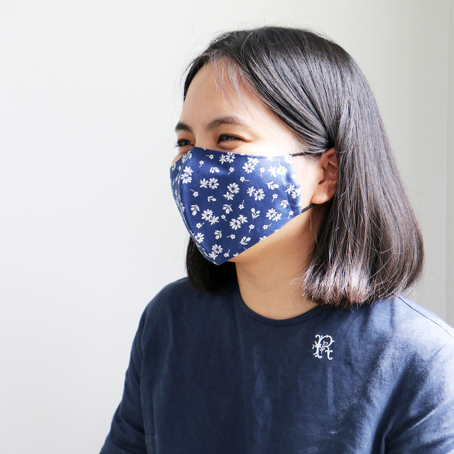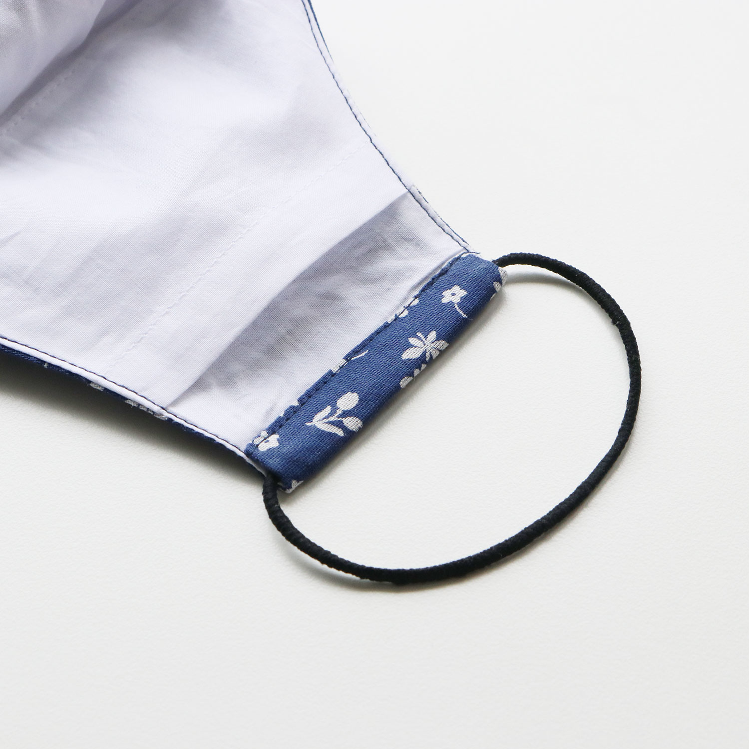 หน้ากากผ้าฝ้าย 100% ตัดเย็บด้วยความประณีตและใส่ใจ ประกอบด้วยผ้า 2 ชั้น ชั้นนอกเป็นผ้าฝ้ายลายดอกไม้สีขาวบนพื้นสีน้ำเงิน ชั้นด้านในเป็นผ้าฝ้ายมัสลินสีขาวที่ทำหน้าที่กรองได้อย่างดีเยี่ยม สายรัดสีดำให้ผิวสัมผัสนุ่มและเบา ด้านในของหน้ากากมีช่องสำหรับสอดแผ่นกรองเพิ่มเติมได้เองด้วย