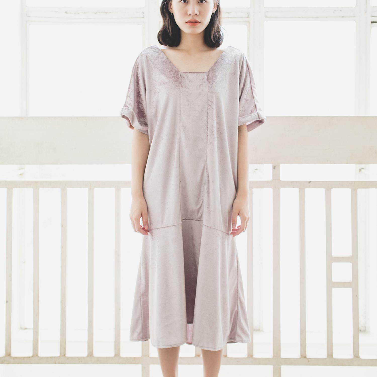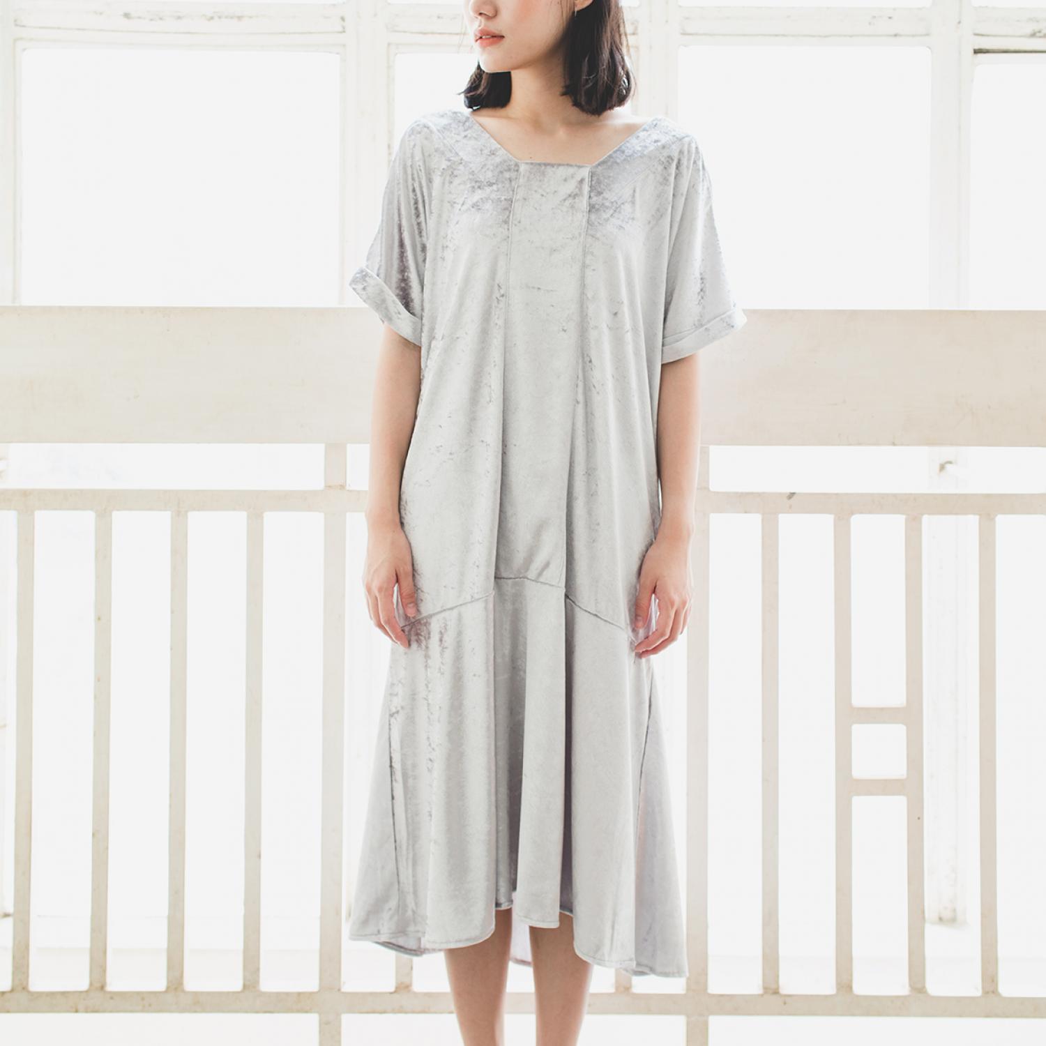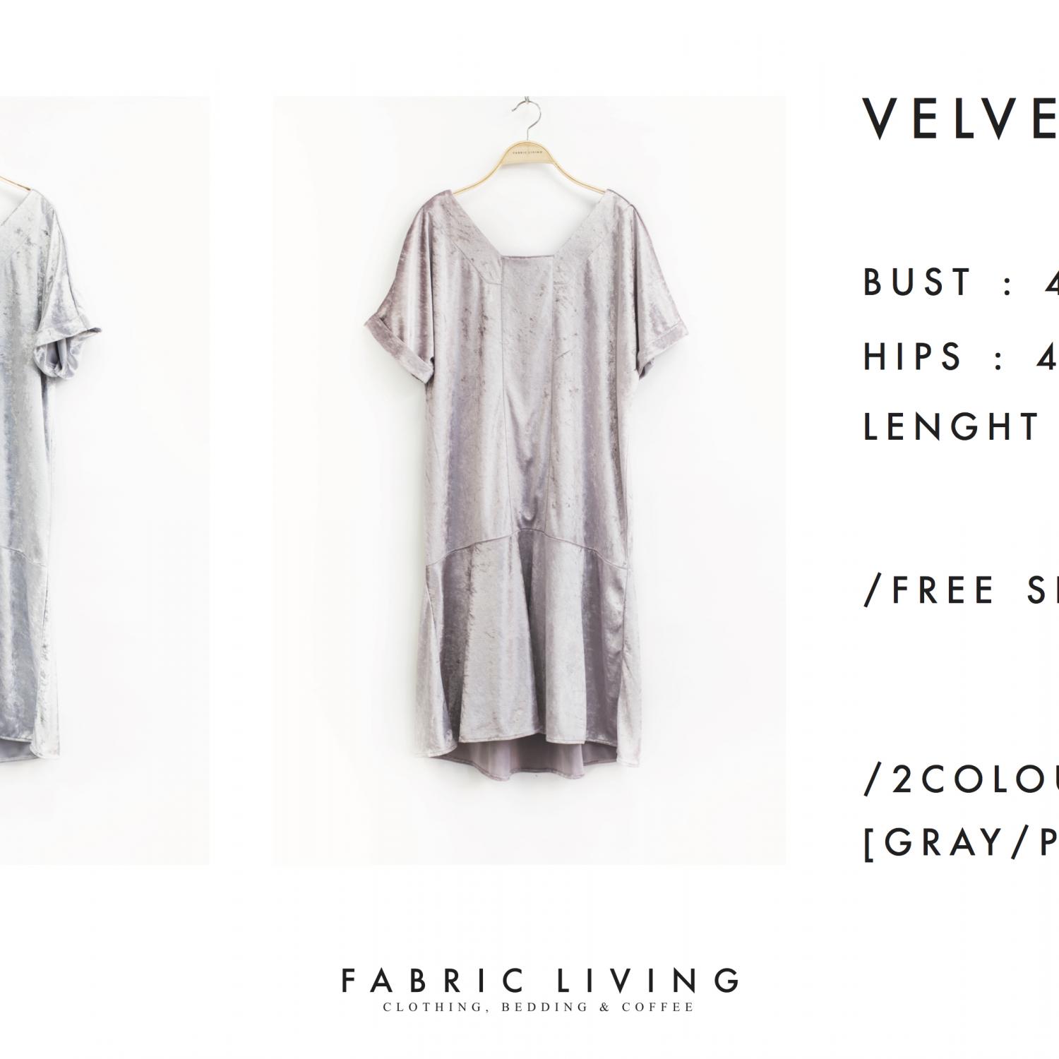 velvet frilled dress ชุดกระโปรงที่ออกแบบอย่างทันสมัยด้วยผ้ากำมะหยี สีเทาและชมพู