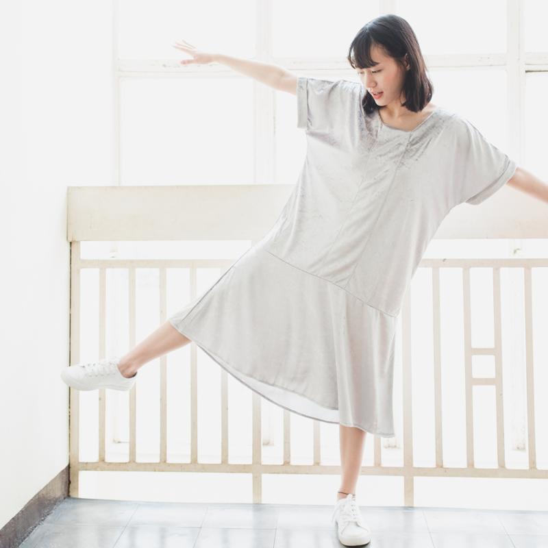 ชุดกระโปรงความยาวขนาดกลาง ตัดเย็บด้วยผ้ากำมะหยี่ที่ ตัดต่อผ้าบริเวณชายกระโปรงให้ดูมีน้ำหนักและทิ้งตัวสวย โดดเด่นด้วยสีอ่อนอย่างเทาและชมพู ดูทันสมัยในแบบที่เรียบง่าย