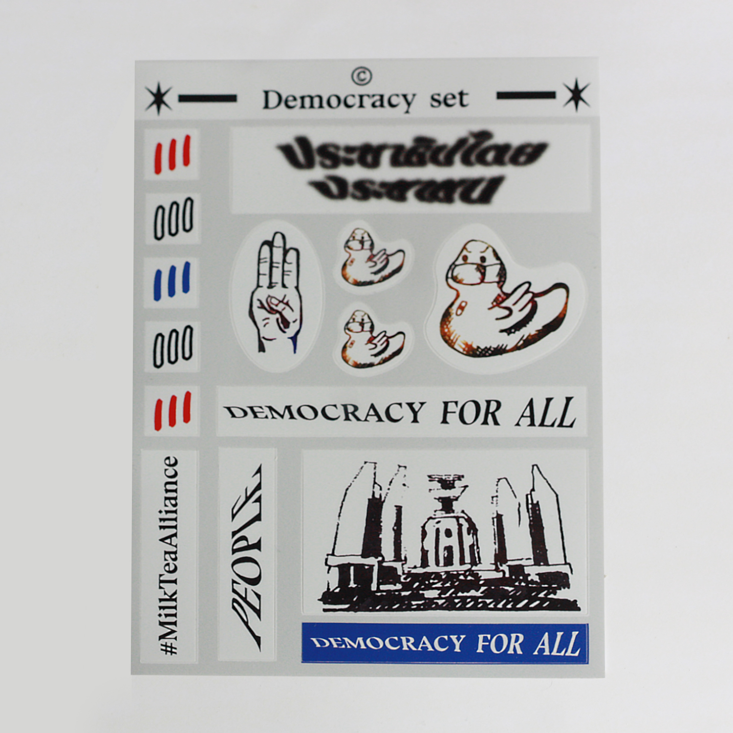 This sticker collection is dedicated to provoking the voice of people, not just only in Thailand but also the countries where people's voice had not been heard, people's lives had not been treated fairly, and to emphasize the statement that 'The rights in Democracy belongs to the citizen in its nation'