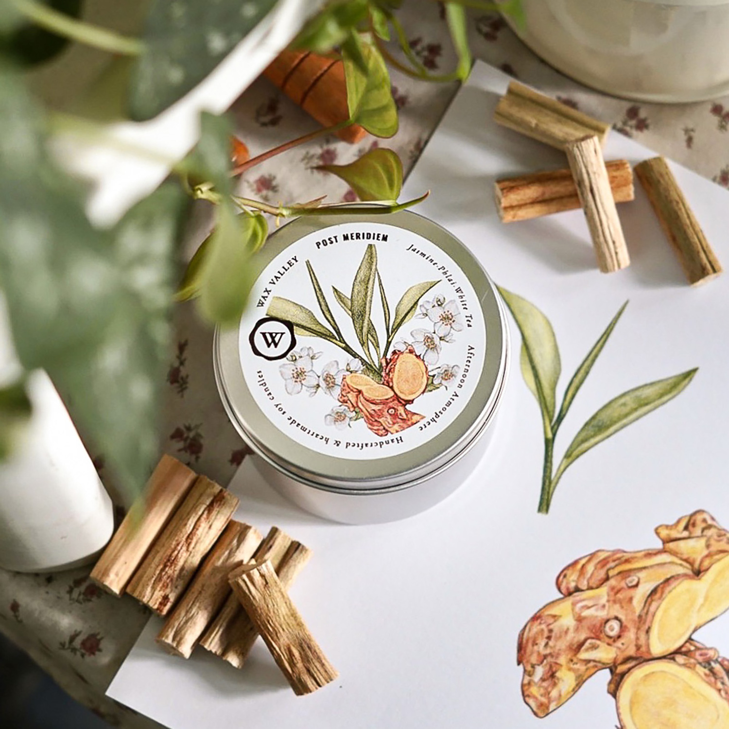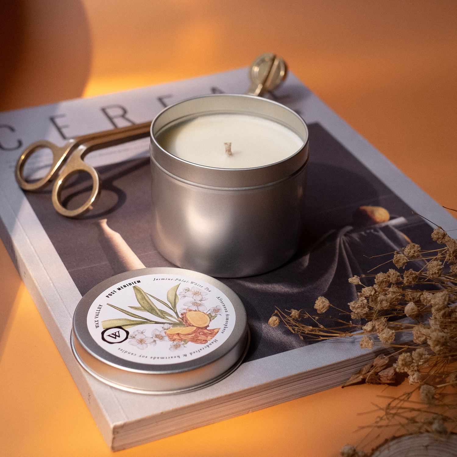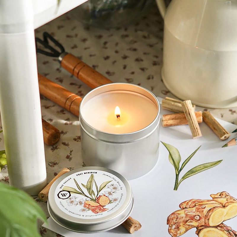 เทียนไขถั่วเหลืองธรรมชาติ กลิ่น Post Meridiem ขนาด Portable Tin ส่วนผสมระหว่างชาขาว และมะลิ เพื่อเติมเต็มบรรยากาศยามบ่าย