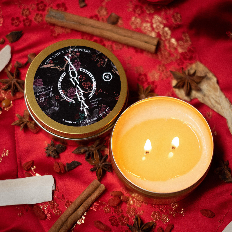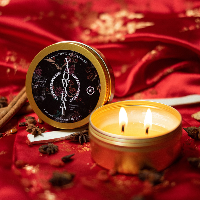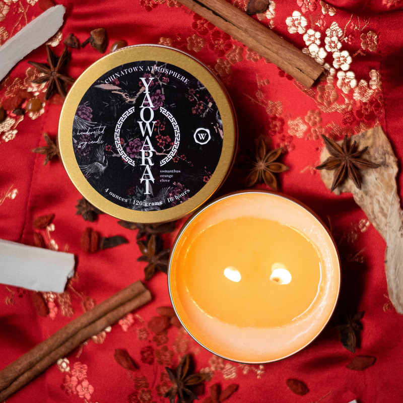 เทียนหอมไขถั่วเหลือง Yaowarat ขนาด Travel Tin ส่วนผสมระหว่างกลิ่นดอกหอมหมื่นลี้, ส้ม และกานพลู เพื่อบรรยากาศ Chinatown