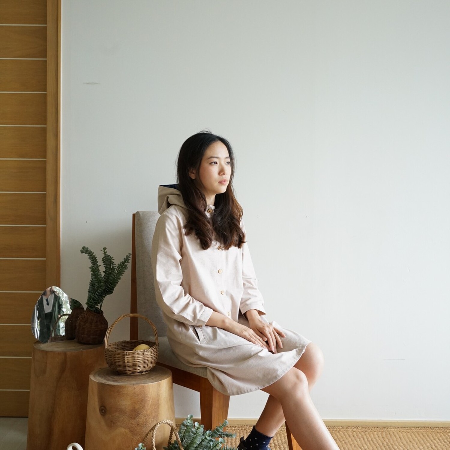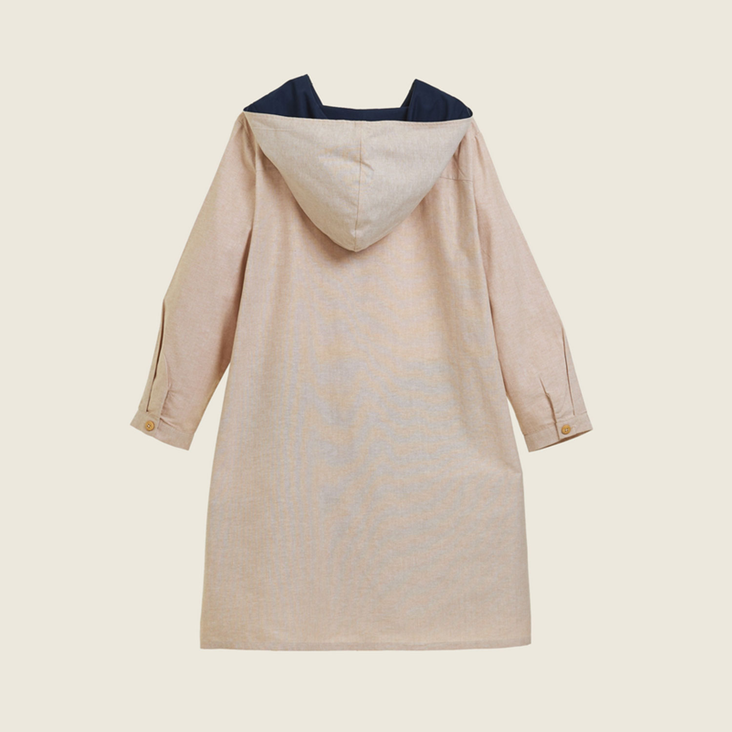 เดรสฮู้ดสีสลับ ดีเทลแน่น ผ้าคอตตอนนุ่มระบายอากาศได้ดี ใช้เป็นเสื้อคลุมเติมลุคให้สนุกขึ้นแถมบังแดดและฝนปรอยได้ด้วย หรือจะติดกระดุมหน้าให้ลุคเดรสตัวเดียวจบออกจากบ้านได้เลย กระดุมที่แขนเสื้อ กระเป๋าข้างซ่อนสีสลับ