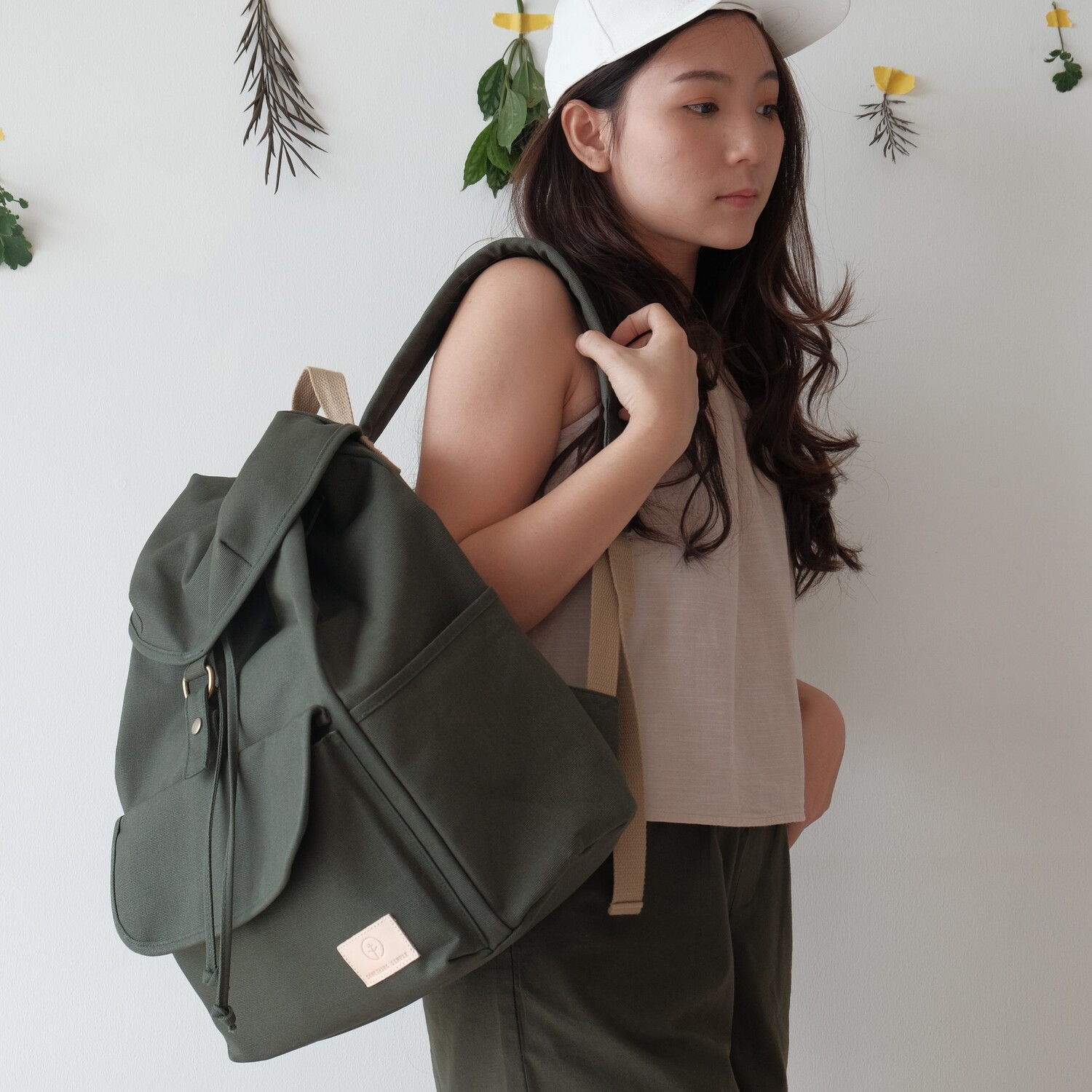 กระเป๋าเป้ ผ้าแคนวาส ทรงรูดพร้อมฝาปิด ซับในผ้าโพลีเอสเตอร์แคนวาสกันน้ำ มีช่องบุฟองน้ำสำหรับใส่แล็ปท็อป ฐานกระเป๋ากว้างบุกันกระแทก จุของได้มาก สายกระเป๋าบุโฟมนุ่ม รับน้ำหนักได้ดี สามารถปรับความยาวสายได้ตามสรีระ มีช่องซิปด้านใน ช่องตาข่ายจัดระเบียบ ช่องซิปซ่อนใต้ฝากระเป๋า ช่องฝาปิดด้านหน้ากระดุมแม่เหล็ก และสองช่องด้านข้างเหมาะสำหรับใส่ร่มพับหรือขวดน้ำ