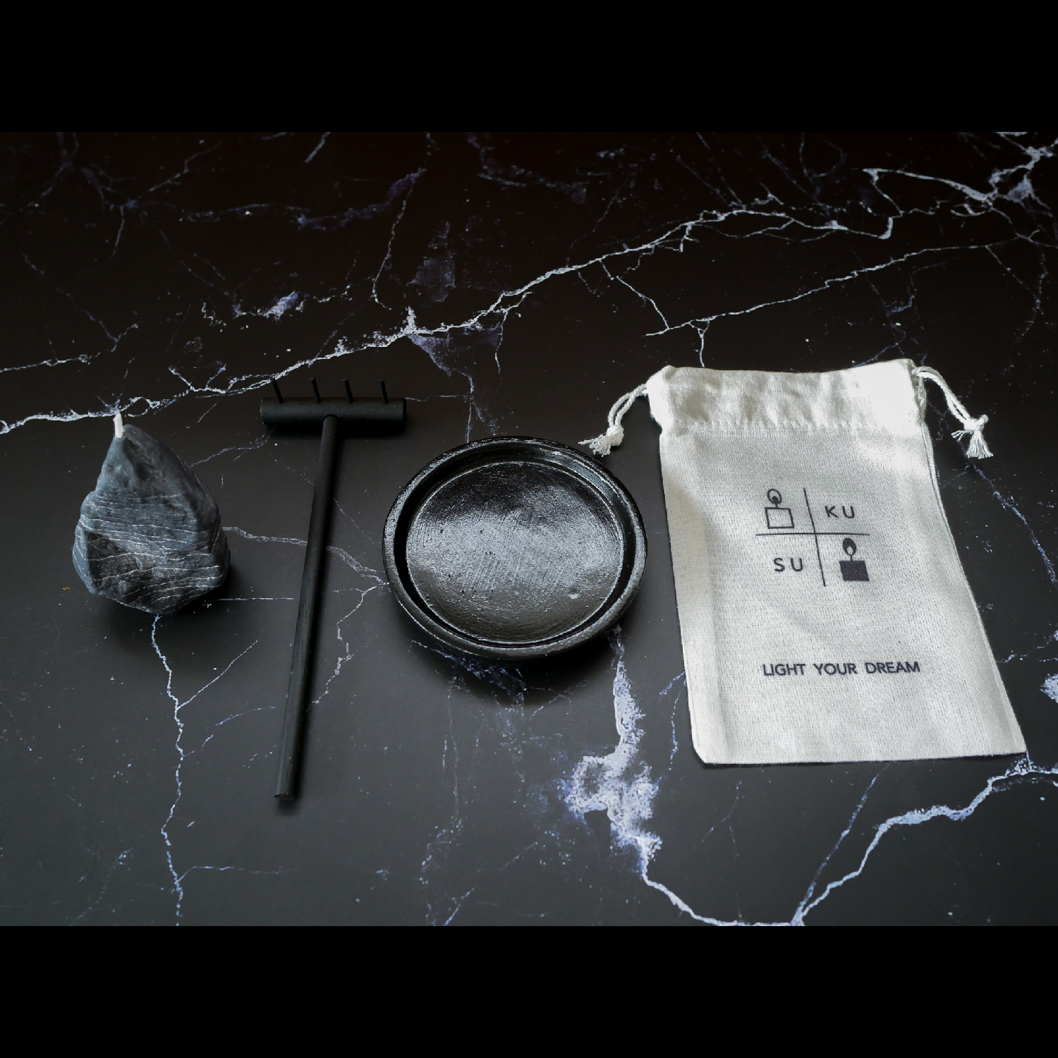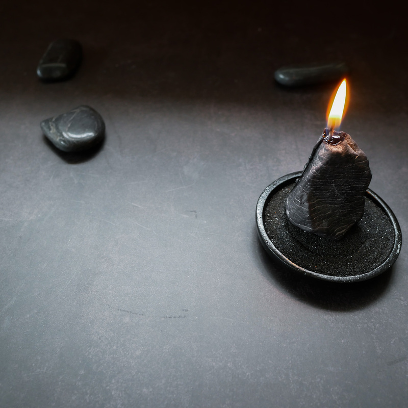 1. เทียนหินสีดำ 1 ก้อนพร้อมถุงผ้า (เทียนหินทำจากปาล์มแวกซ์)