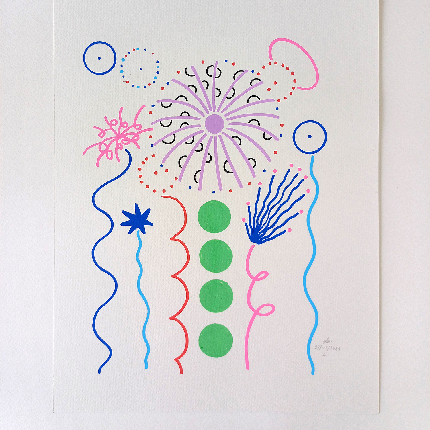 ผลงานที่ออกมามีรูปร่างหลากหลายตามจิตนาการที่ปรากฏขึ้นในสมองเมื่อเห็นเส้นหรือสีก่อนหน้านั้น
