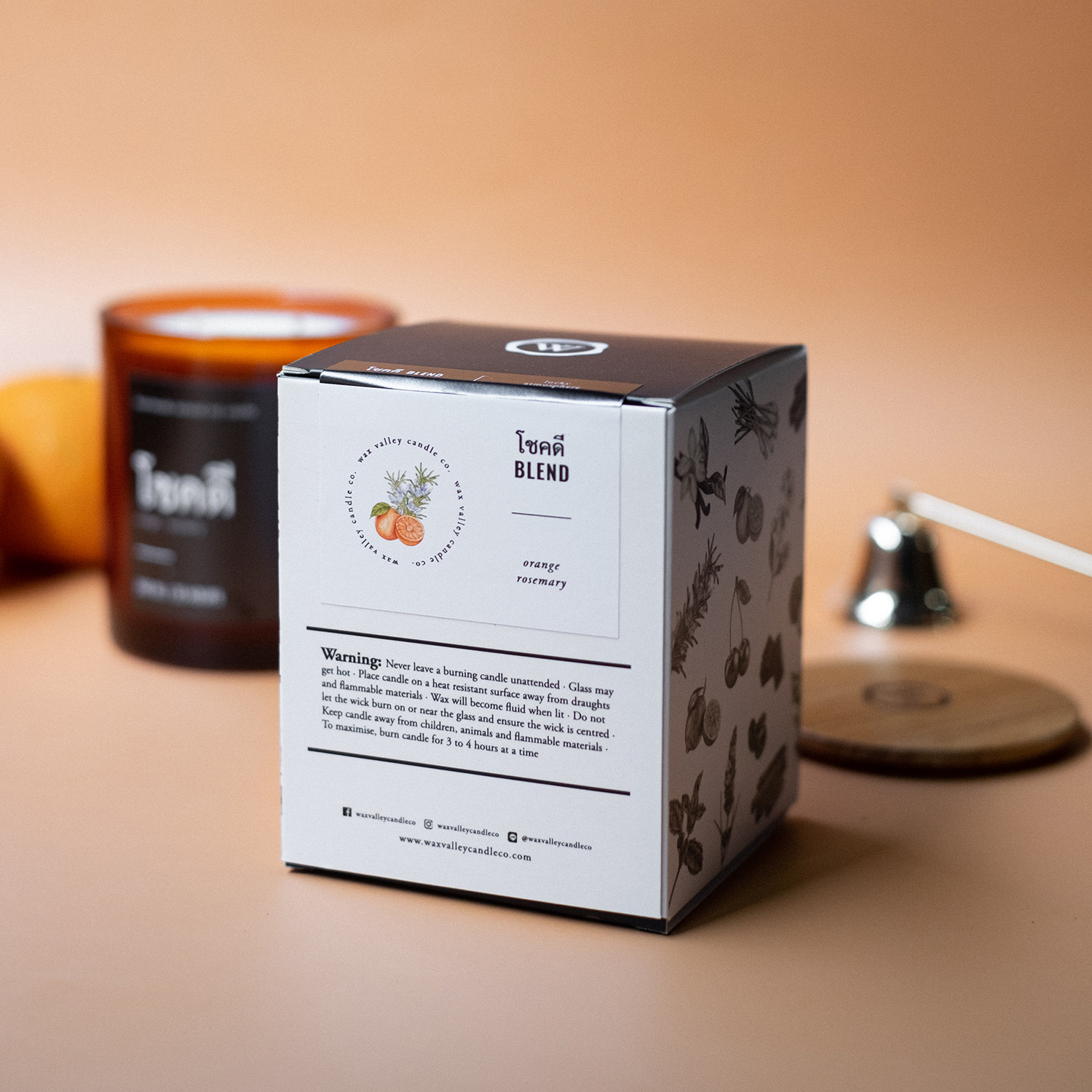 นี่จึงเป็นแรงบันดาลใจก่อให้เกิด Blend ลำดับที่ 9 ของ Wax Valley และเลข 9 เราเชื่อว่าเป็นเลขมงคล ซึ่งพ้องเสียงกับคำว่าก้าวในภาษาไทย เป็นการผสมผสานความเข้ากันระหว่างส้ม ผลไม้มงคลที่เรามักนำไปมอบให้ผู้หลักผู้ใหญ่ในวันสำคัญ หรือเพื่อการสักการะบูชา และความหอมของกลิ่นดอกโรสแมรี่ ที่เป็นดอกไม้ตัวแทนแห่งความทรงจำ เปรียบเสมือนการได้อยู่กับตัวเอง เรียนรู้ ทบทวน และจดจำช่วงเวลาดีๆ ที่ผ่านเข้ามาในชีวิต และจึงเตรียมตัวให้พร้อมสำหรับก้าวใหม่ในการเริ่มต้นสิ่งดีๆ ต่อไป