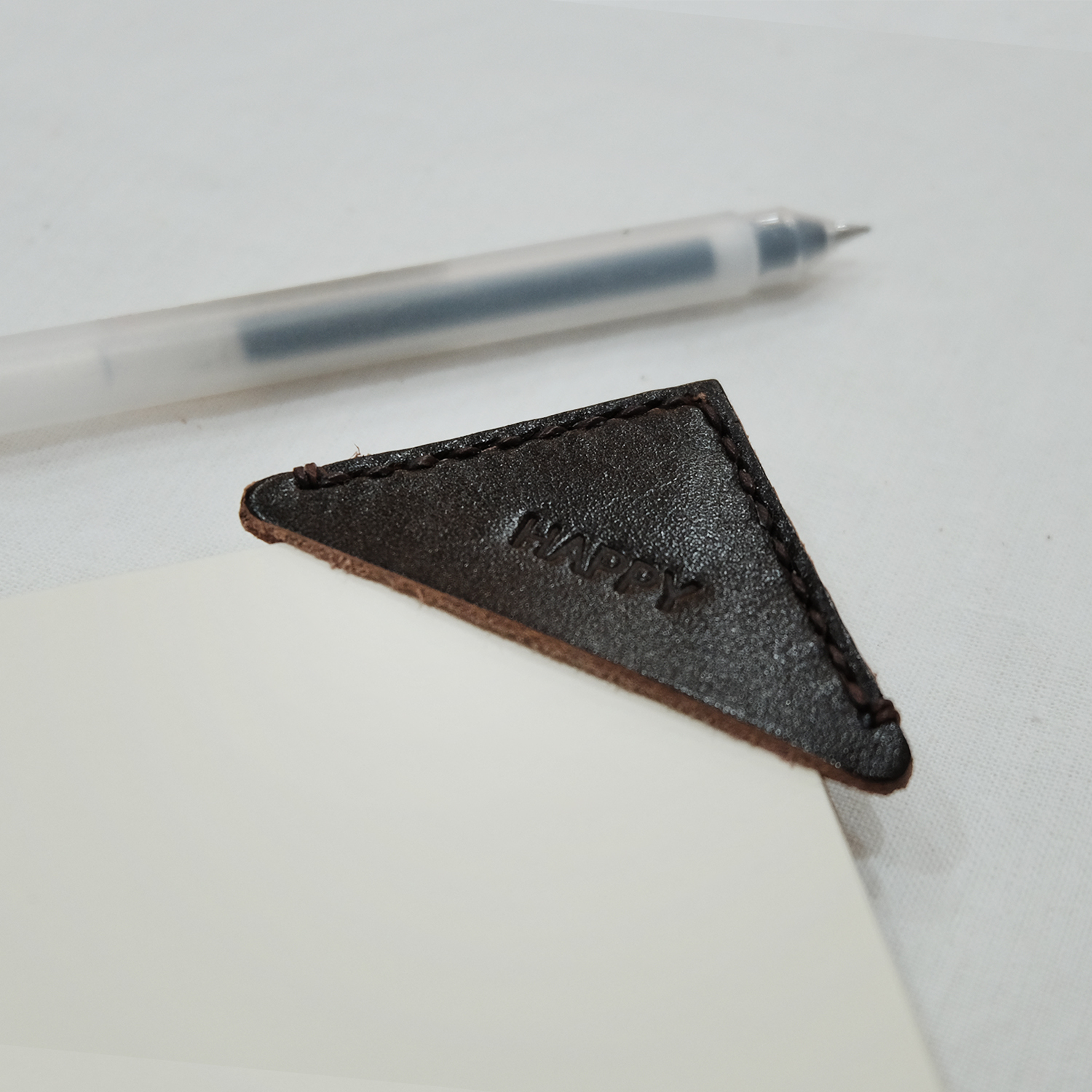 ออกแบบที่คั่นหนังสือให้คนที่รักการอ่าน ด้วยที่คั่นหนังสือรูปทรงสามเหลี่ยมรับกับมุมหนังสือ ทำจากหนังแท้และการเย็บมืออันปราณีต ใช้งานได้อย่างง่ายด้วยการเสียบเข้ากับมุมของหนังสือเล่มโปรดที่เราอ่านค้างไว้ นอกจากช่วยคั่นหน้าหนังสือยังเติมแต่งความน่ารักลงบนชิ้นงานด้วย